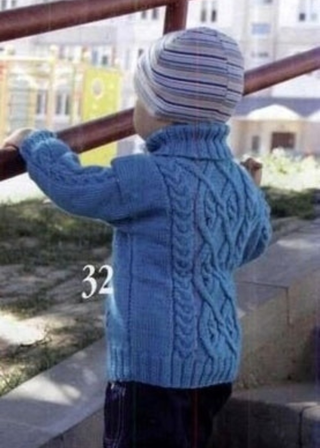 Спинка: на спицы № 2,5 набрать 80 п. и связать 4 см резинкой 2 х 2, в последнем изнаночном ряду равномерно прибавить 6 п., провязывая их скрещенной из протяжки между петлями ( = 86 п.) Продолжить спицами № 3 в следующем порядке: кром., 14 лиц., 56 п. схемы, 14 лиц., кром. На высоте 38 см от начала вязания закрыть все петли.