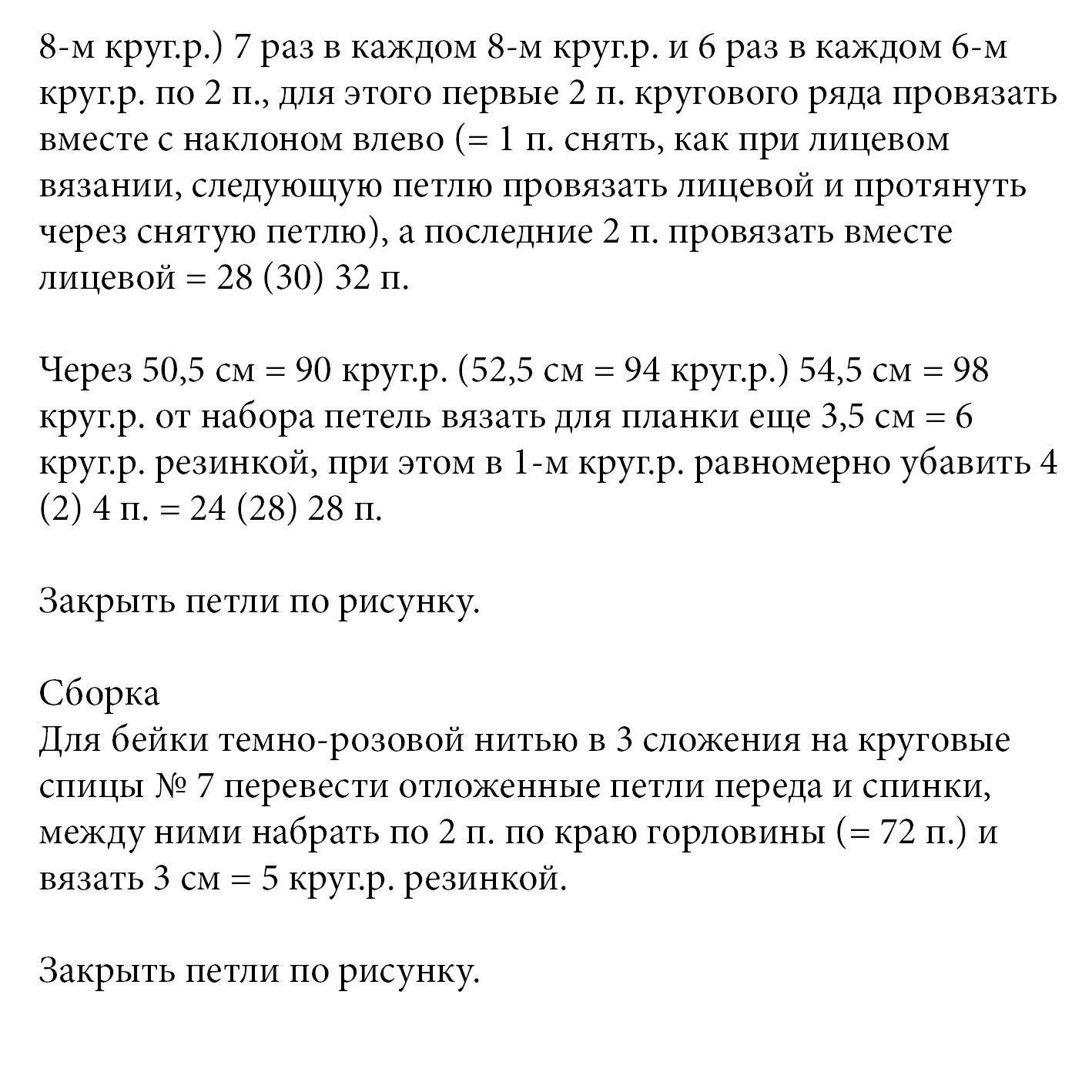 26 (28) 30 круг.р. лицевой гладью и 2 круг.р. ажурным узором темно-розовой нитью,