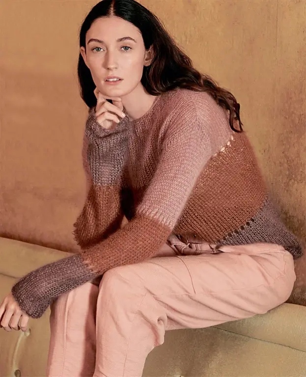 Пряжа (58% мохера, 42% шелка; 310 м/25 г) – по 50 (75) 100 г темно-розовой, цв. нуги и коричневой; спицы № 7; круговые спицы № 7.