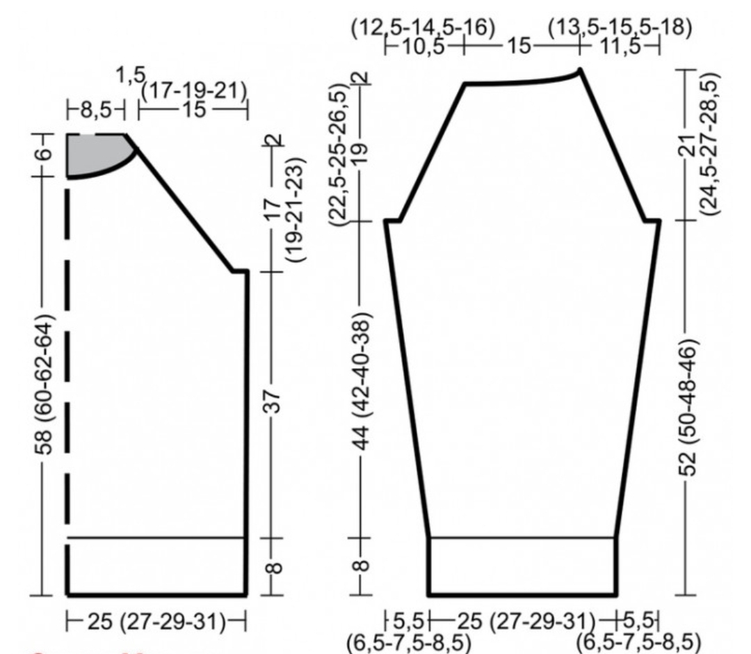 Через 36 (38-40-42) см = 88 (94-98-102) р. от планки закрыть с правого края 1 раз 2 (2-3-2) п., затем для регланных скосов закрыть в каждом 4-м р. 10 (12-13-11) раз по 1 п. и в каждом 2-м р. 5 (5-6-12) раз по 1 п., с левого края закрыть 1 раз 2 (3-3-3) п. и затем убавить (см. Декоративные убавки) для регланных скосов в каждом 4-м р. 9 (13-13-11) раз по 1 п. и в каждом 2-м р. 4 (1-4-9) раза по 1 п.