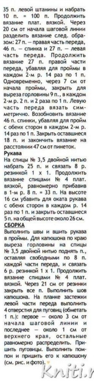 35 п. левой штанины и набрать 10 п. = 100 п. Продолжить вязание плат, вязкой. Через 20 см от начала шаговой линии разделить вязание след. образом: 27 п. — правая часть переда, 46 п. — спинка и 27 п. — левая часть переда. Продолжить вязание 27 п. правой части переда, убавляя для проймы в каждом 2-м р. 14 раз по 1 п. Одновременно, через 7 см от начала проймы, закрыть для выреза горловины 9 п., в каждом 2-м р. 2 п. и 2 раза по 1 п. Левую часть переда вязать симметрично. Возобновить вязание 46 п. спинки, убавляя для пройм с обеих сторон в каждом 2-м р. 14 раз по1 п. Закрыть оставшиеся 18 п. и закончить вязание на расстоянии 47 см от пинеток.