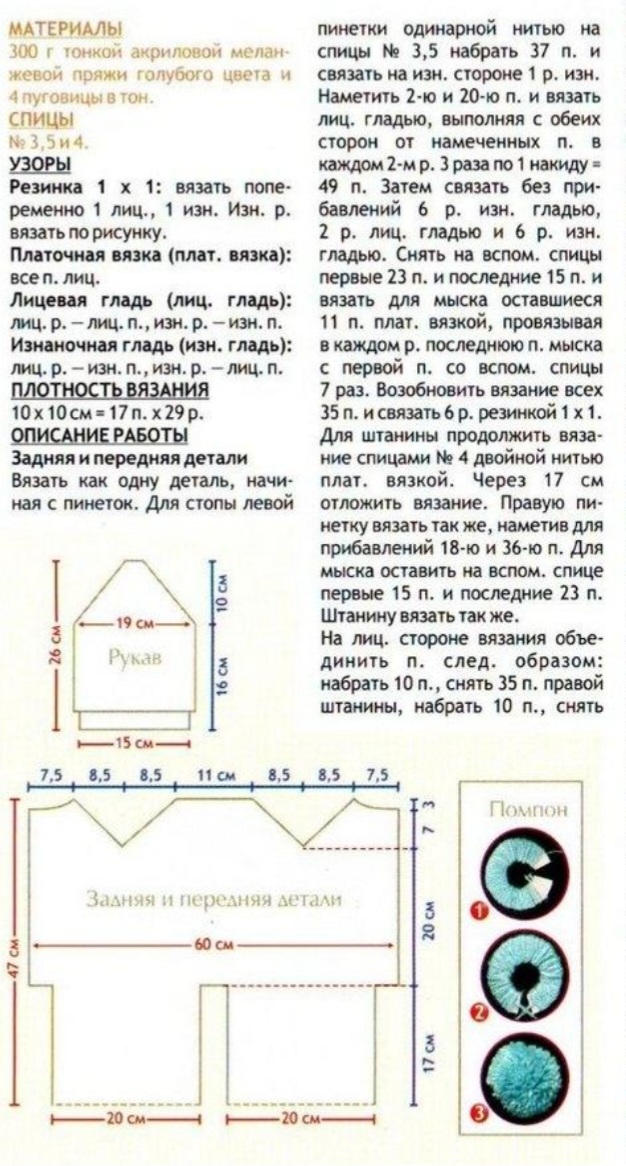 300 г тонкой акриловой меланжевой пряжи голубого цвета и 4 пуговицы в тон. СПИЦЫ № 5,5и4.