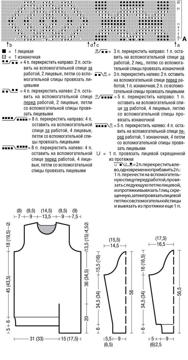 Через 6 см = 20 р. вязать на спицах № 4 узор из аранов и «кос», причем петли распределить в следующей последовательности: кром., 0 (4) п. изнаночной гладью, 2 раза повторить раппорт = 54 п. между стрелками а и b, закончить 2 п. после стрелки b и кром. = 112 (116) п. после 1-го р.