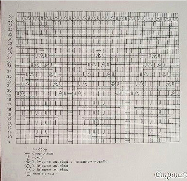 3 ряд - 1 кромочная, 3 лиц., накид, 1 лиц., накид, 3 лиц., 1 изн... в конце ряда 3 лиц., 1 кромочная.