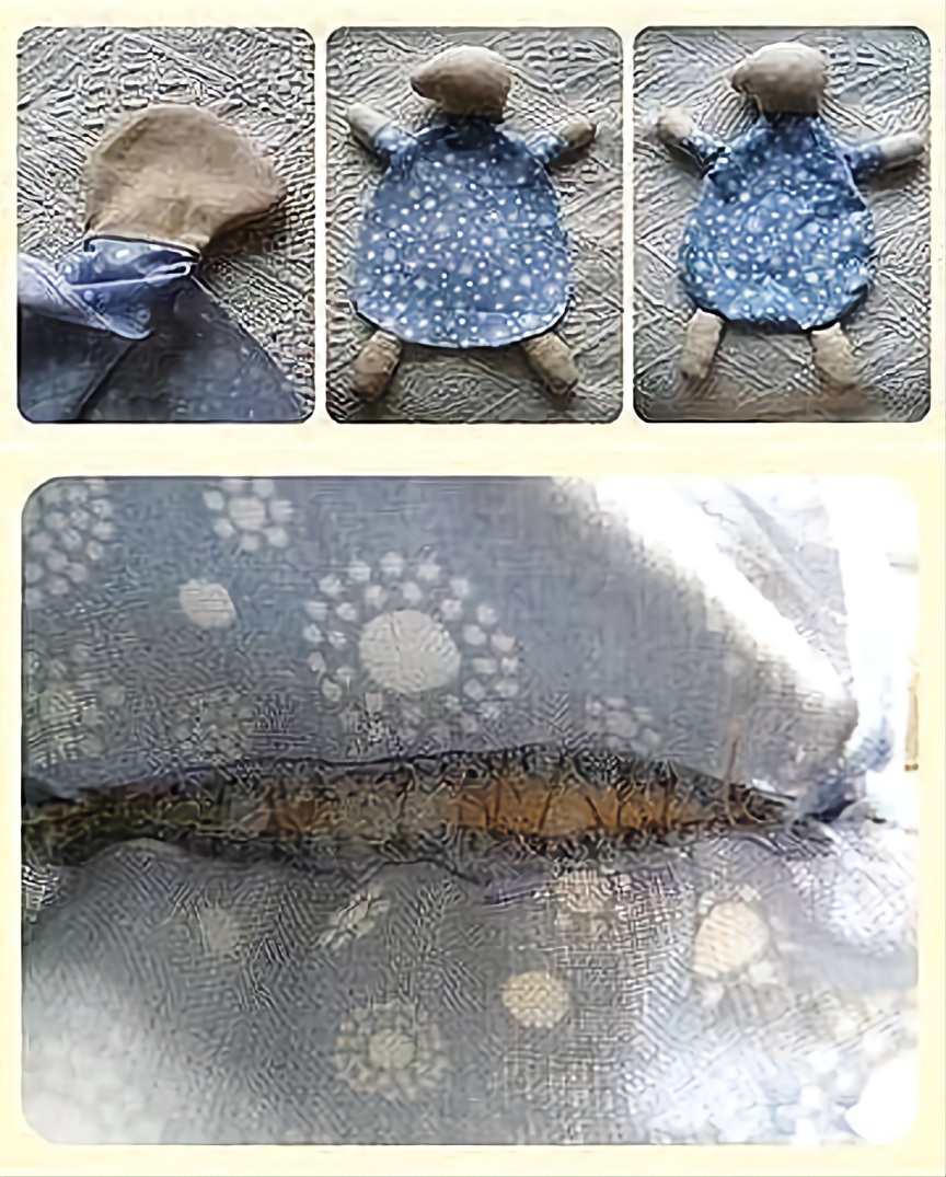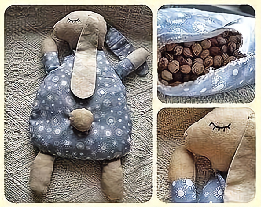 Набивается вишневыми косточками , используется в основном для облегчения боли при кишечных коликах у младенцев. В остальное время прекрасно сидит или спит в кроватке (косточки придают игрушке устойчивость)