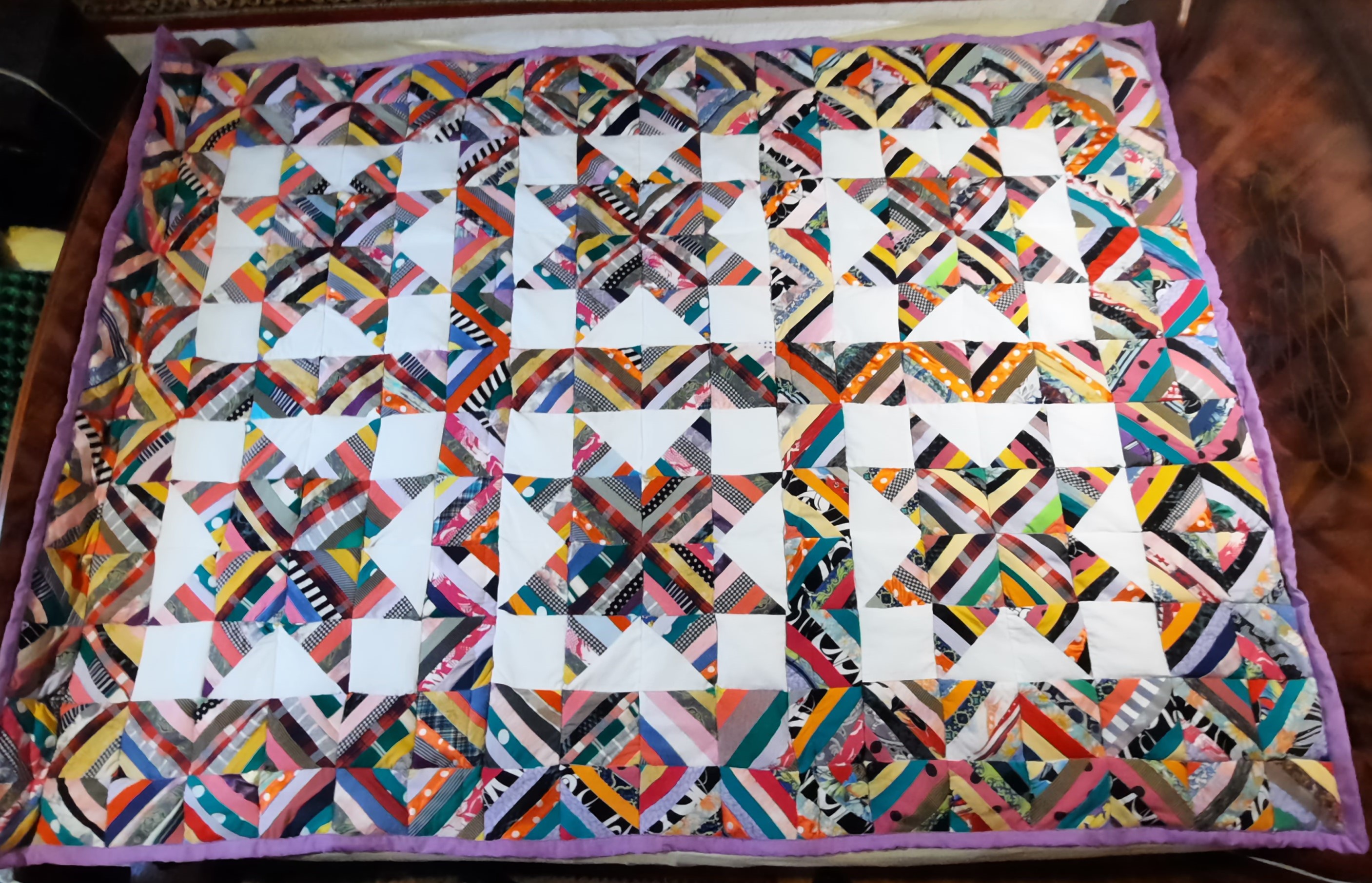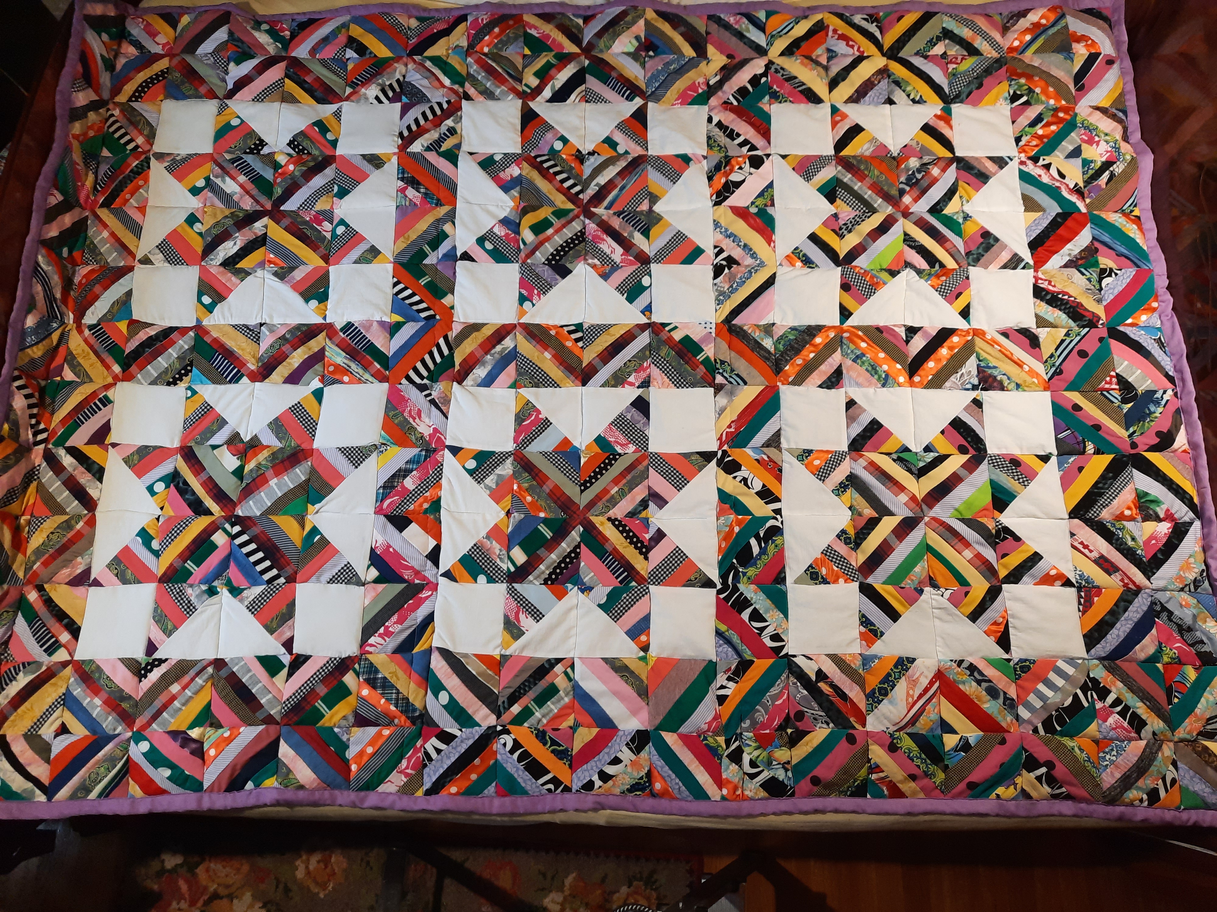 Дизайн менялся по ходу шитья,т.к. расчетные размеры при шитье не совпали с задумкой.Конечный размер 160Х220 см.Верх исключительно из б/у тканей.бэк-советский ситец,наполнитель синтепон 150 г,м кв,вес 2 кг.Получилось тяжелее моих предыдущих,т.к. полоски дают дополнительную толщину.Синтепон тонковат