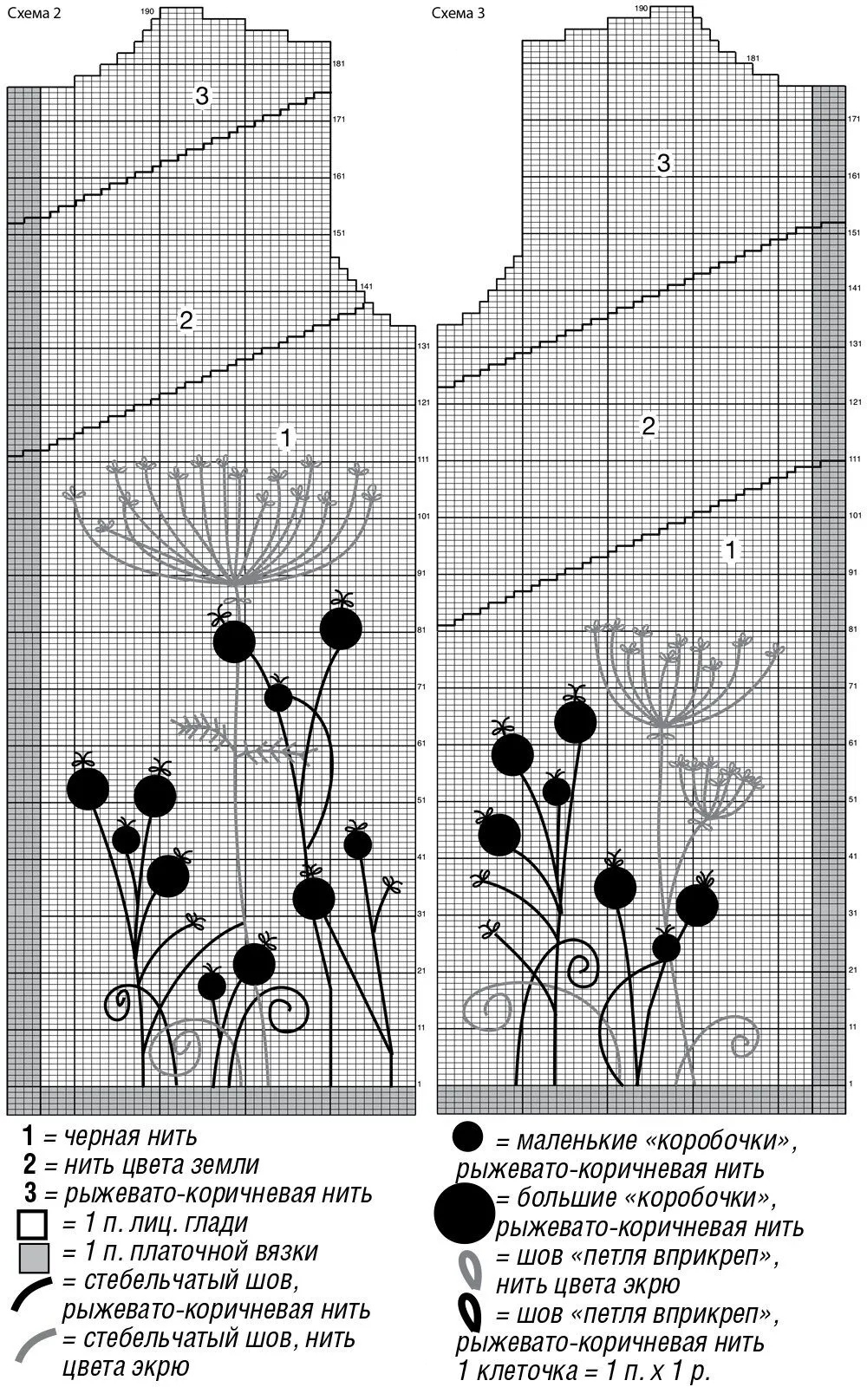 Отсчет рядов по схемам 2 и 3 начинается от нижней планки (1-й ряд = 1-й ряд после планки). Размеченные на схемах 2 и 3 мотивы вышивки при вязании опускаются, вышивка выполняется дополнительно на готовом вязаном полотне.