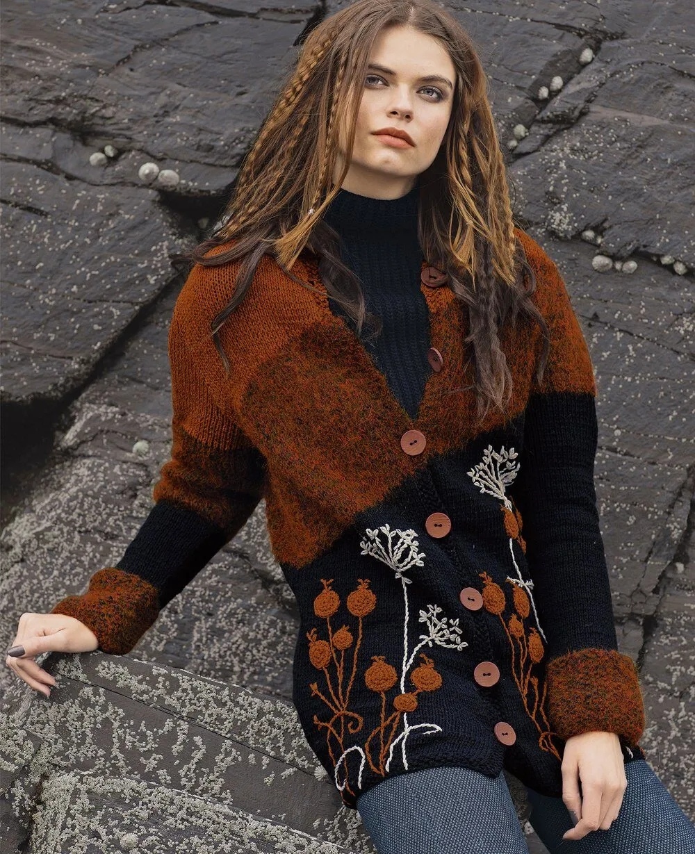 Кардиган в широкую полоску из гладкой и фасонной пряжи щедро украшен вышивкой — осенними растительными мотивами в натуральную величину.