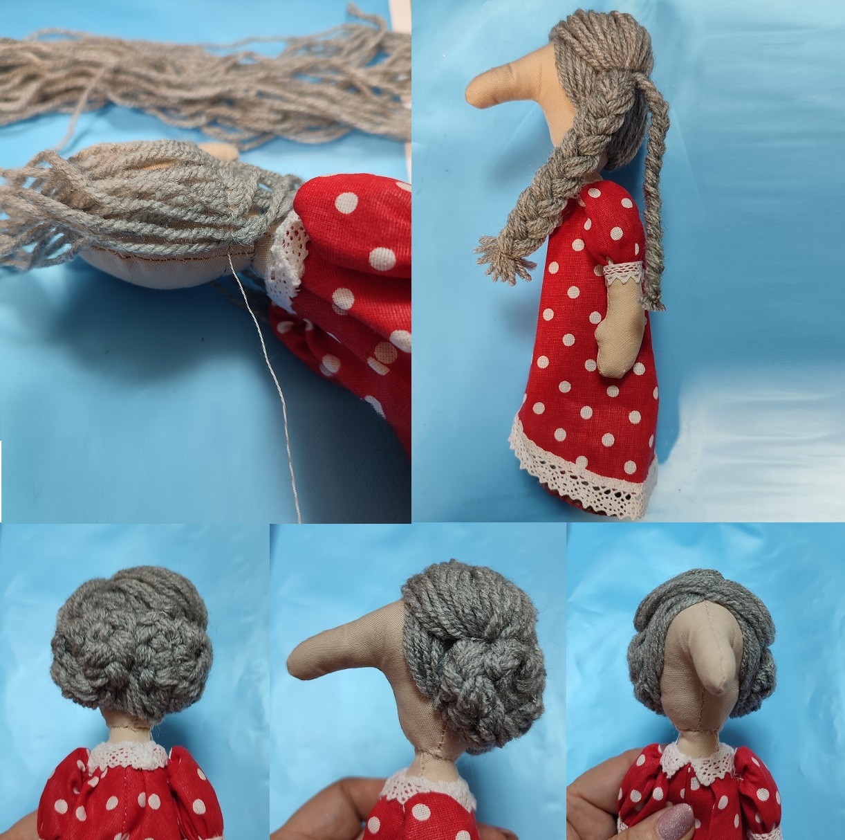 Шею зашила потайным швом и вставила в нижнюю часть головы, пришила крепко потайным швом.