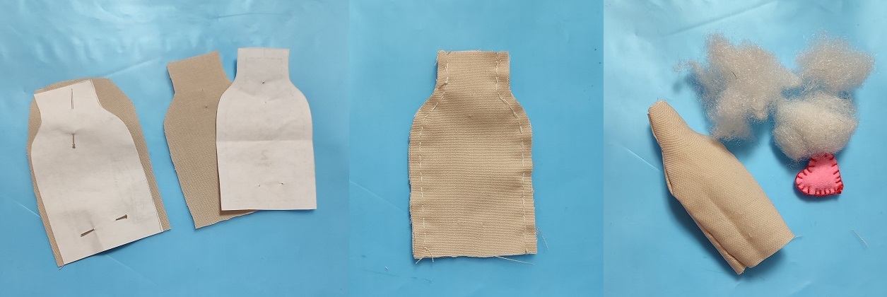 |Выкраиваю тело нашей старушки, сшиваю две детали по боковым швам (низ и верх не зашиваем).Начинаю набивать тело наполнителем. На уровне груди вкладываю сердечко и продолжаю набивку.