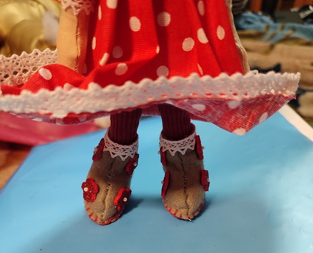 Вшиваю подошву вкруговую красными нитками мулине. Верхний край валенок подогнула на 0,7 см внутрь и подшила вручную. По верхнему краю валенок пришила кружевную тесьму. Украсила валенки цветочками, которые пришила к валенкам при помощи бисера.