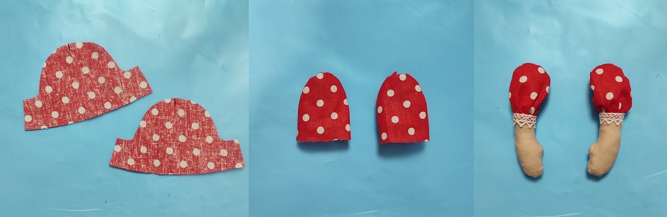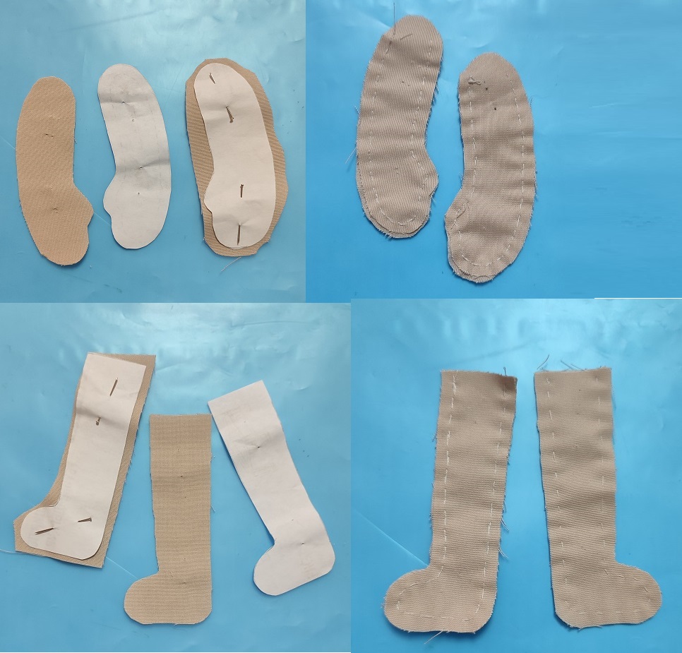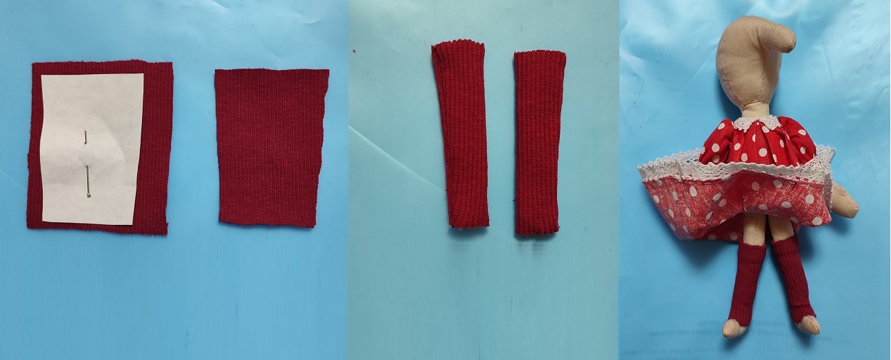 Ткань для гетров должна быть трикотажная. Сшиваю гетры по вертикальному шву.Подгибаю верхний край на 0,5 см и одеваю на ноги, пришиваю их к ногам.