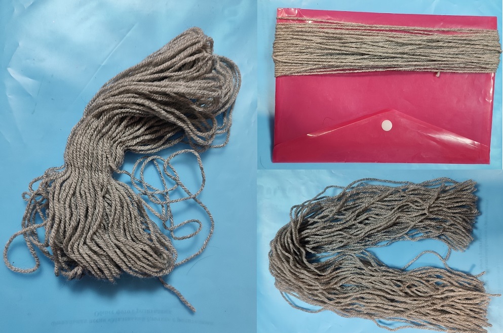 Намотала пряжу на подручный материал (длина 25 см), разрезала с одной стороны. Получилось 50 прядей по 50 см.