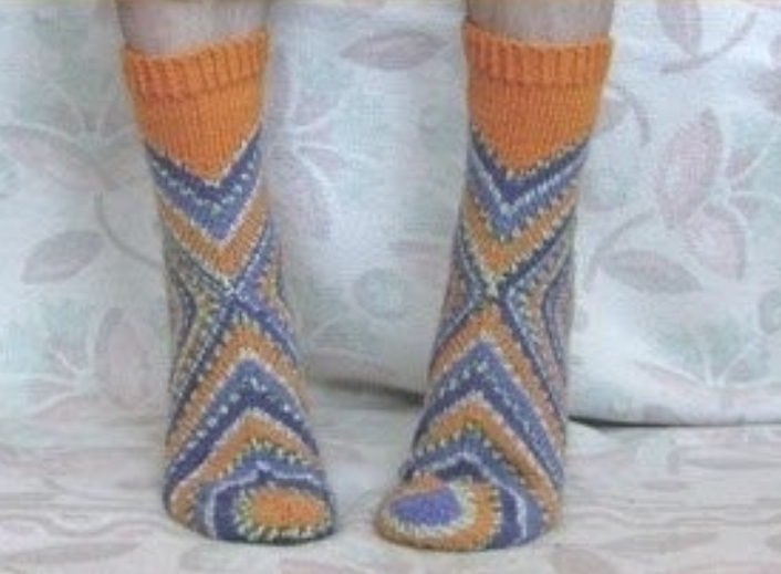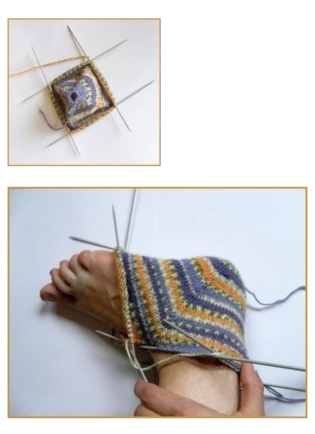 Так получается четырёхугольная, похожая на мисочку, часть. Количество петель и промежуточных рядов зависит от толщины пряжи и спиц, от почерка вязания, от размера носка. Вязать нужно до тех пор, пока противоположные углы не сомкнутся на ноге ( у меня было к этому времени по 35 петель).