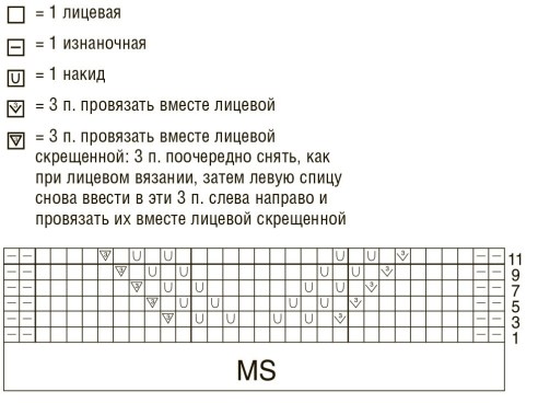 Вязать по схеме. На ней приведены лицевые ряды и нечетные круговые ряды. В изнаночных рядах петли вязать по рисунку, накиды провязывать изнаночными.