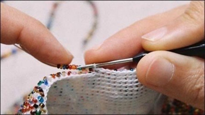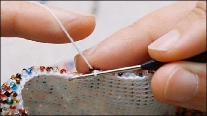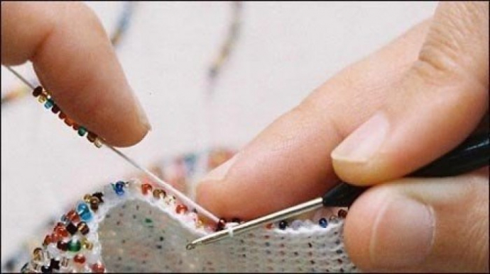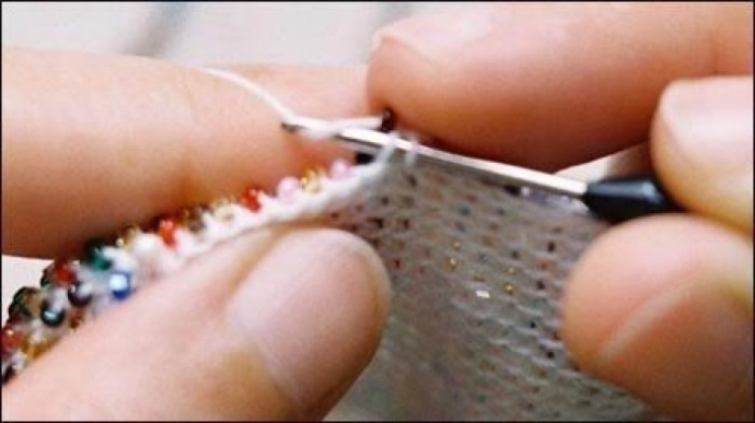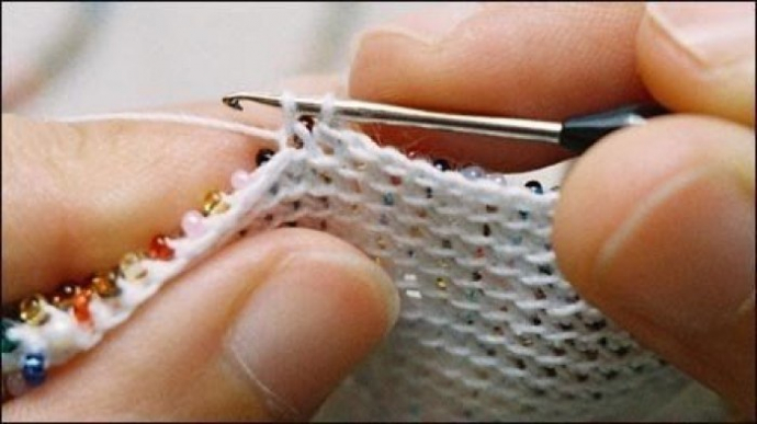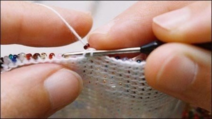 Фото 1: На фото показано положение рук при вязании – небольшое количество бисера указательным пальцем левой руки придвигаем к полотну, одновременно средним пальцем правой руки придерживаем петлю на крючке, предохраняя ее от растяжения.
