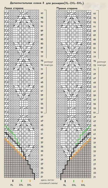 След. круг. р. (прибавок): 1 лиц., 1 изн. прибавить с наклоном влево, затем 61 п. (спинка) след. ряд по схеме, 1 изн. прибавить с наклоном вправо, 1 лиц. *маркер, 1 лиц., 1 изн. прибавить с наклоном влево, далее изнаночные до маркера мотива, маркер, затем изнаночные до 1-й п. перед маркером реглага, 1 изн. прибавить с наклоном вправо, 1 лиц., маркер*, 1 лиц., 1 изн. прибавить с наклоном влево, далее вязать 61 п. по схеме (перед), 1 изн. прибавить с наклоном вправо, 1 лиц.; повторить от * д