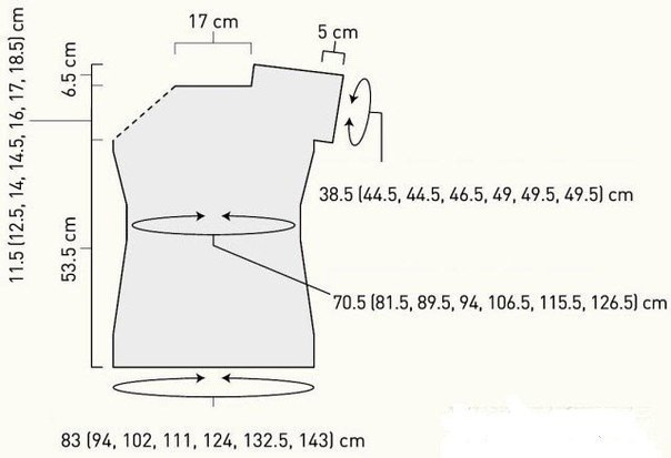 Продолжить как установлено, повторить 2 последних круг. ряда еще 5 раз, закончить 18-м рядом схем спинки и переда и 12-м рядом схемы рукавов = 208 п. (по 63 п. для спинки и переда и по 41 п. для каждого рукава). Перейти на круговые спицы длиной 80 см, когда петель станет больше.