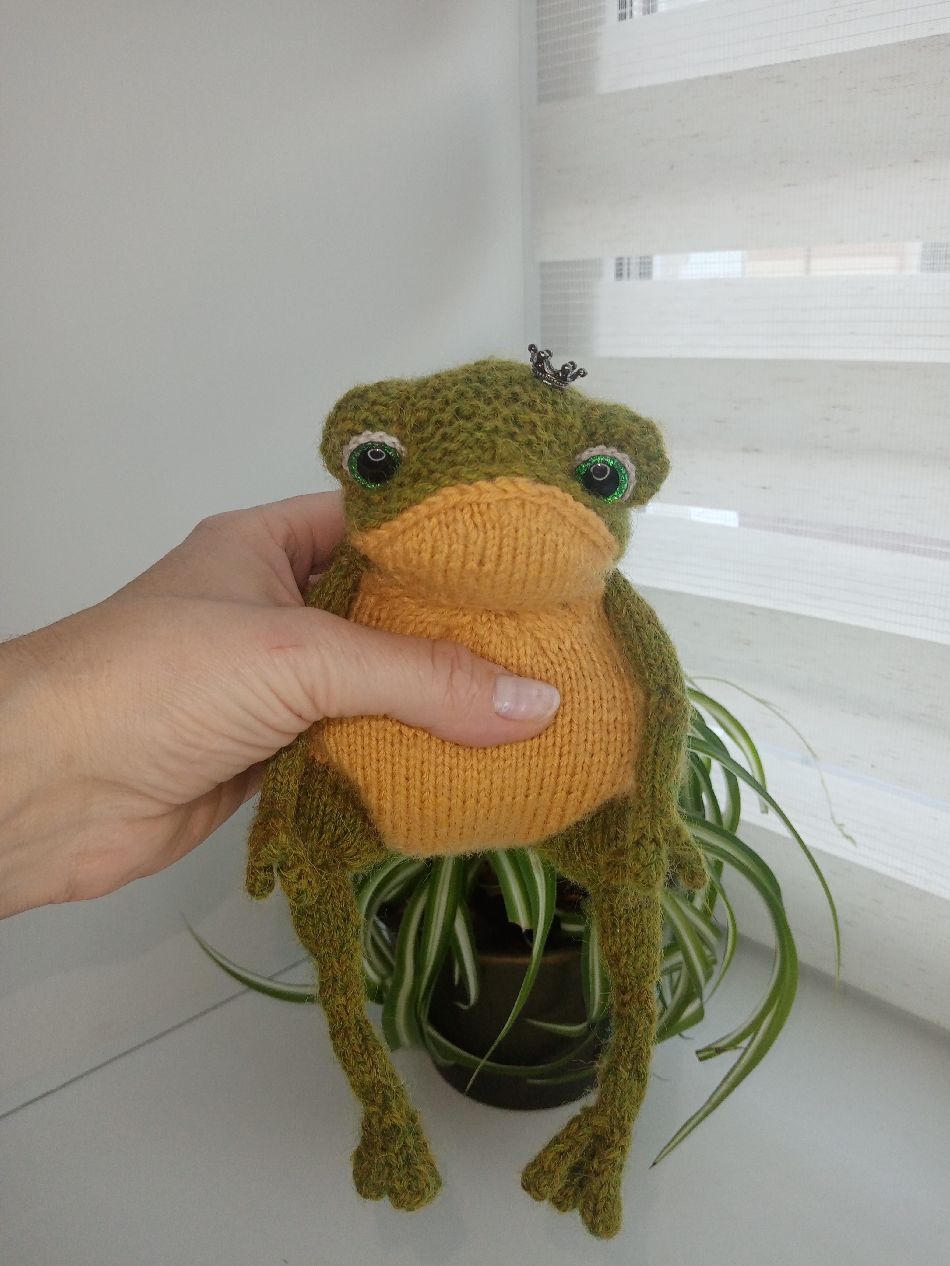 Живой характер. Подвижные лапки будто сами тянутся к вам: их можно аккуратно сгибать и разворачивать, придумывая новые позы и истории. Жабка то устроится по‑королевски на подушке, то запрыгает в воображаемом болоте, то присядет читать книжку.Натуральная нежность. Игрушка связана из мягкой шерстяной пряжи — приятной на ощупь, тёплой и безопасной. В ней чувствуется рукотворность: каждый петельчатый рядок хранит тепло рук мастера.Компактный размер. Ростом всего 20 см, жабка легко помещается в ладошку, рюкзак или карман. Она всегда под рукой — и в дороге, и перед сном, и на весёлой игре.Кому подойдёт такой подарок?