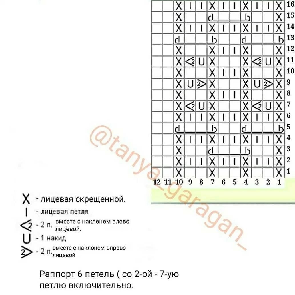 Раппорт 6 петель. в 3,5,13 и 15 ряду обвитие четырех петель.