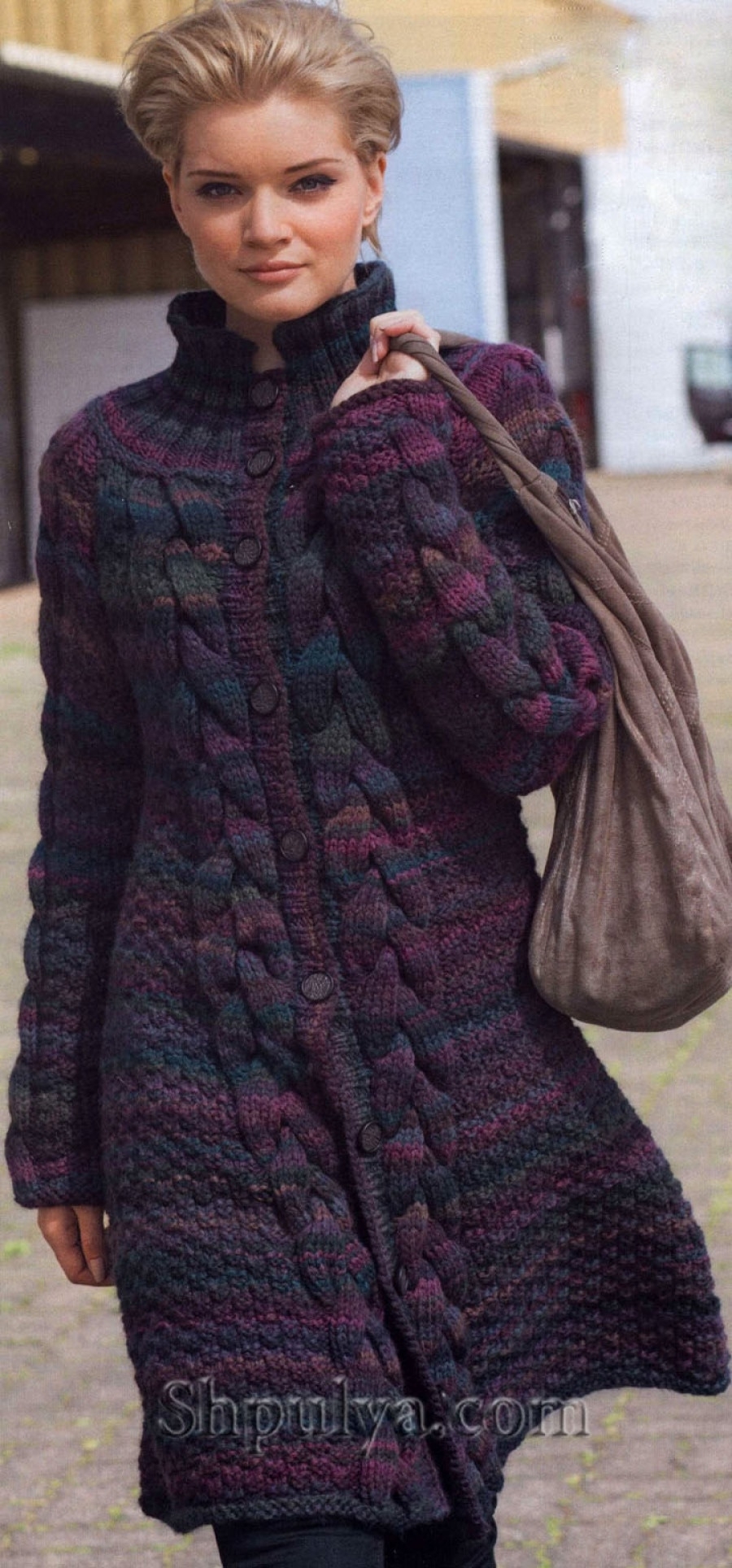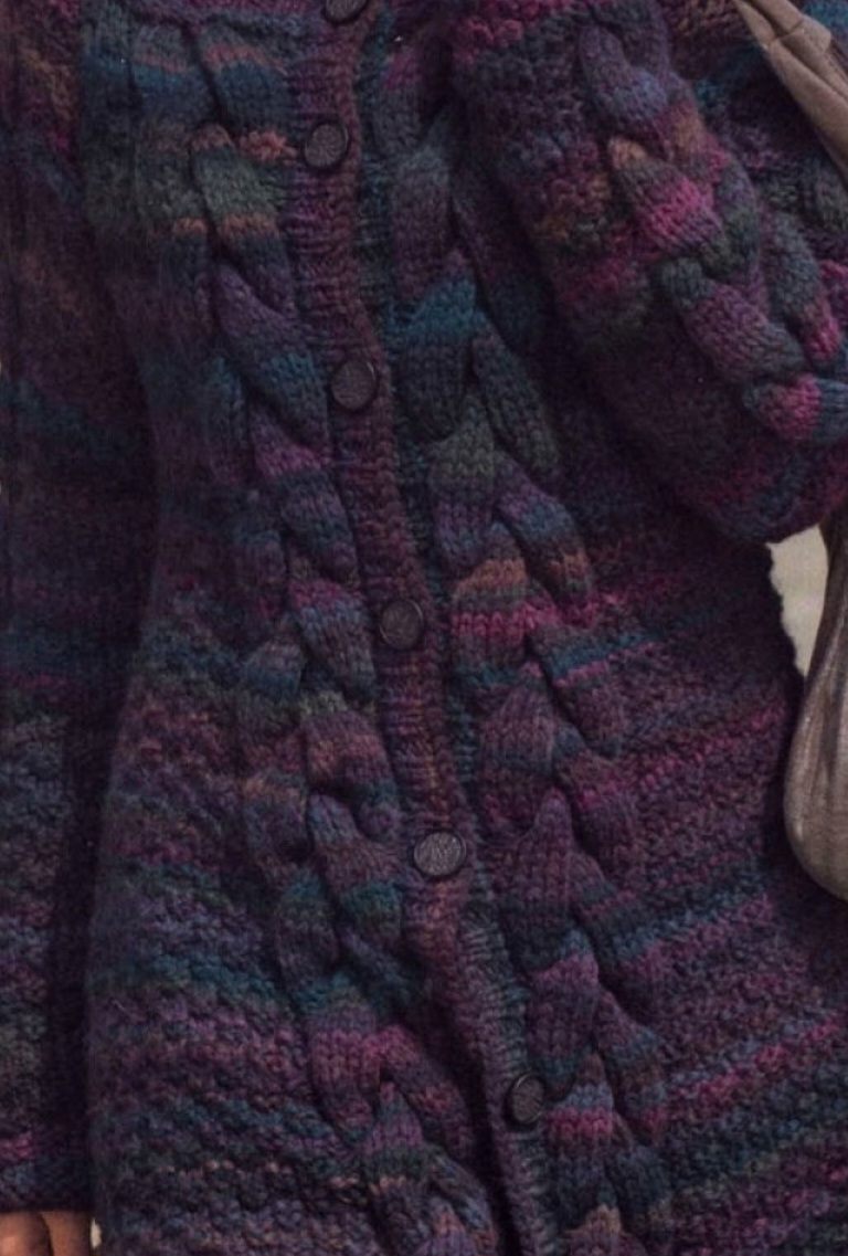 Размеры: 38/40 (44) 48/50. Вам потребуется: 900 (950) 1000 г черничной меланжевой пряжи riga (53% овечьей шерсти, 47% полиакрила, 80 м/50 г); прямые спицы № 8; круговые спицы № 6; 9 пуговиц.