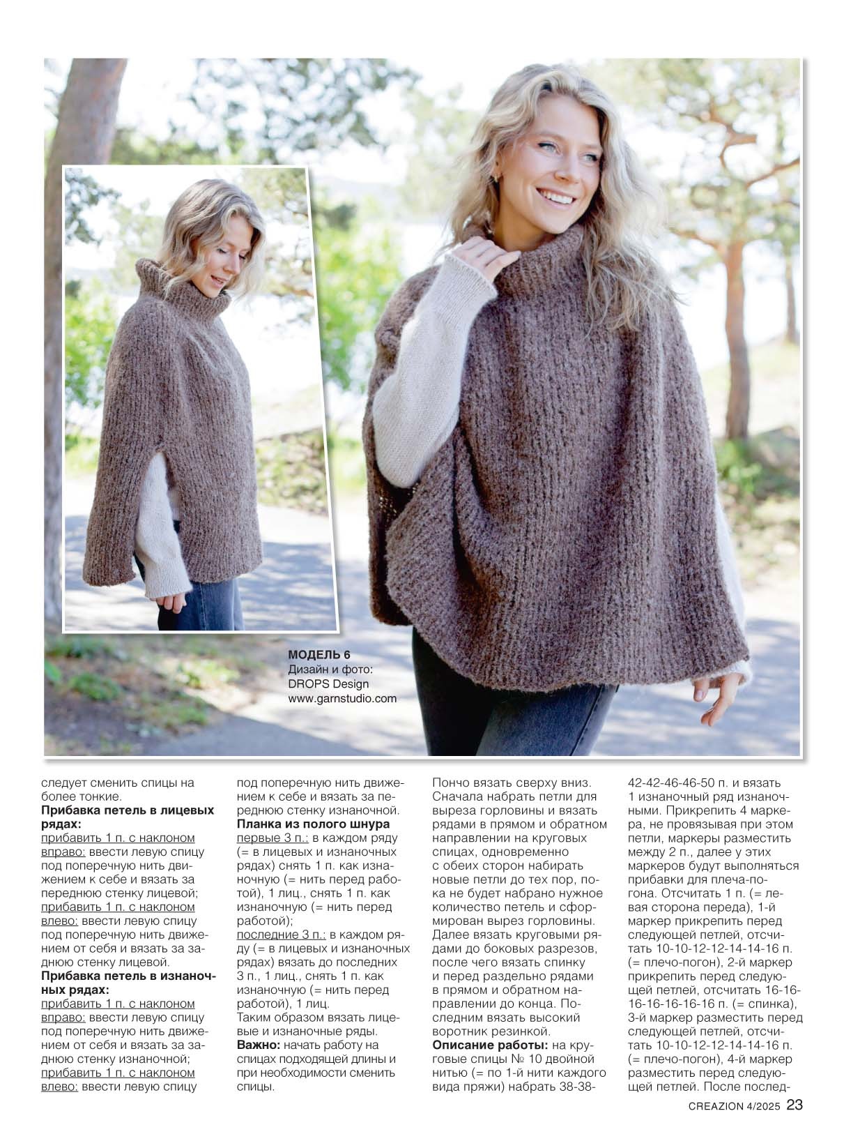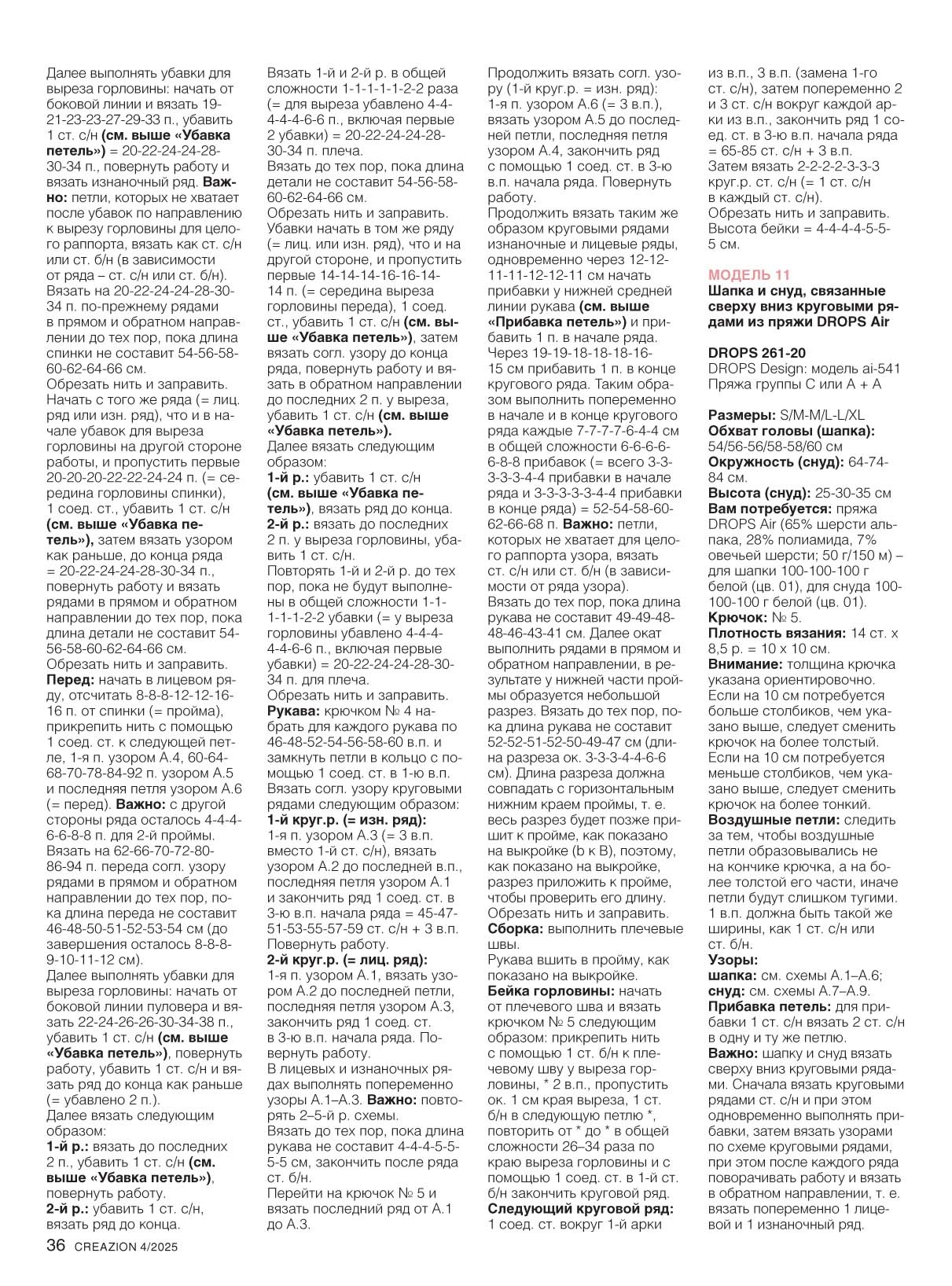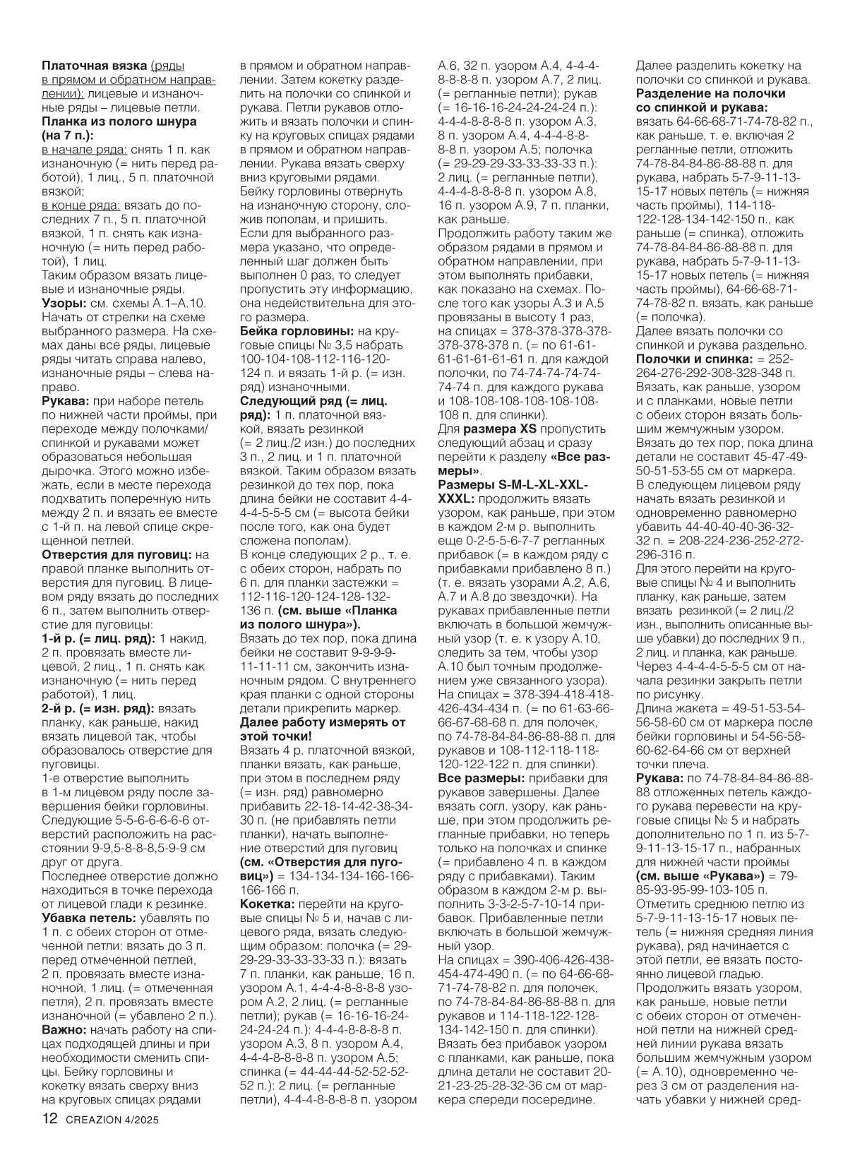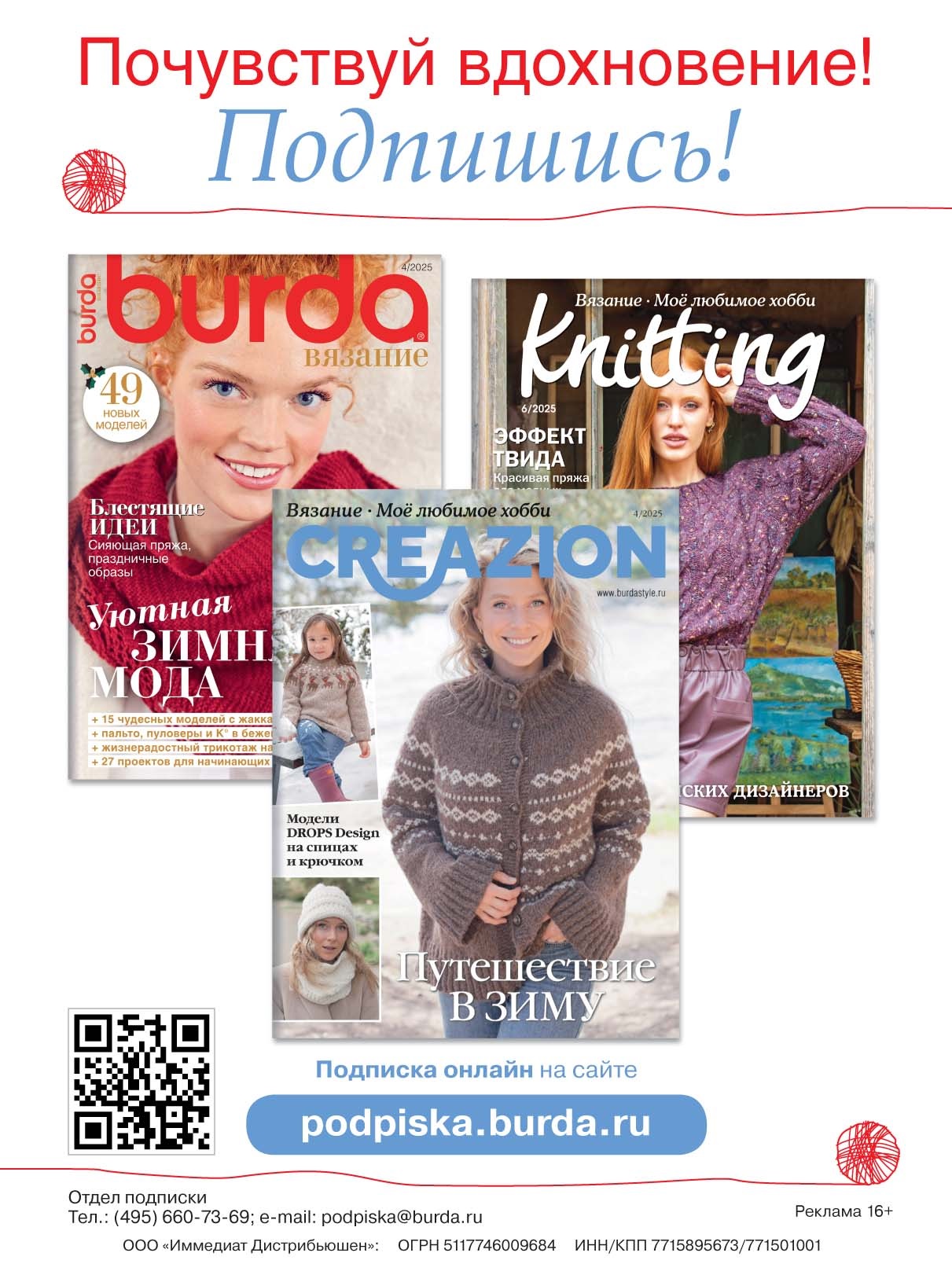 Журнал по вязанию предлагает практичные и одновременно креативные модели европейских дизайнеров. В номере коллекция трикотажа нового сезона, в которой успешно сочетаются базовые и оригинальные модели, связанные на спицах или крючком. Привлекательные детали, а также разнообразные узоры - жаккардовые, ажурные, рельефные - придутся по вкусу самым искушенным любителям вязания.