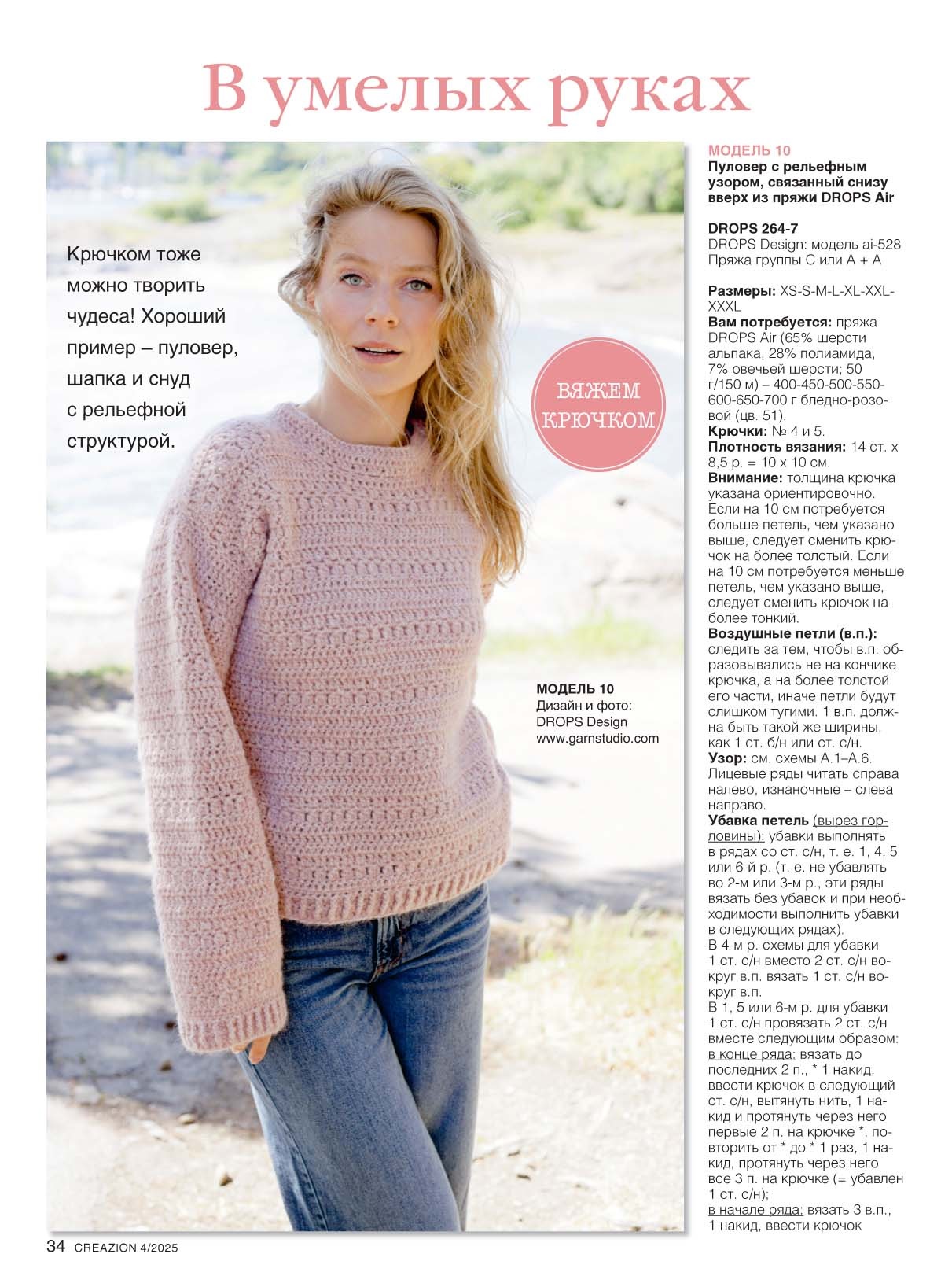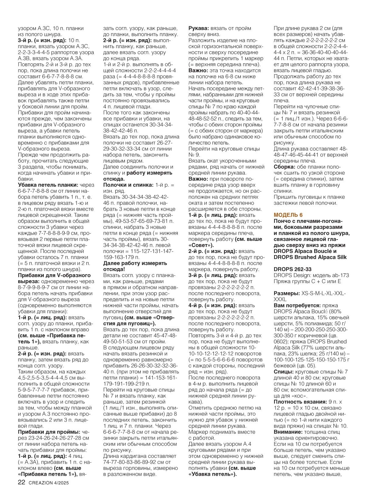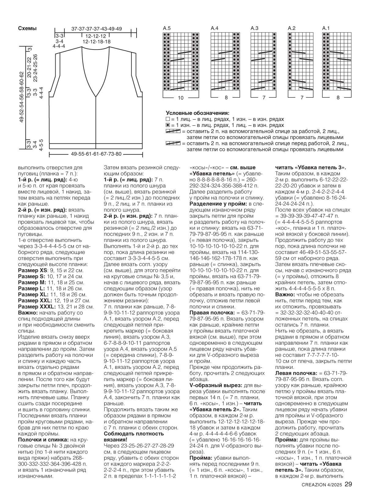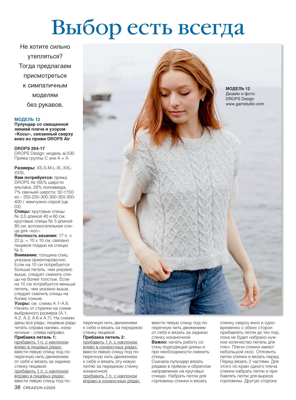 Журнал по вязанию предлагает практичные и одновременно креативные модели европейских дизайнеров. В номере коллекция трикотажа нового сезона, в которой успешно сочетаются базовые и оригинальные модели, связанные на спицах или крючком. Привлекательные детали, а также разнообразные узоры - жаккардовые, ажурные, рельефные - придутся по вкусу самым искушенным любителям вязания.