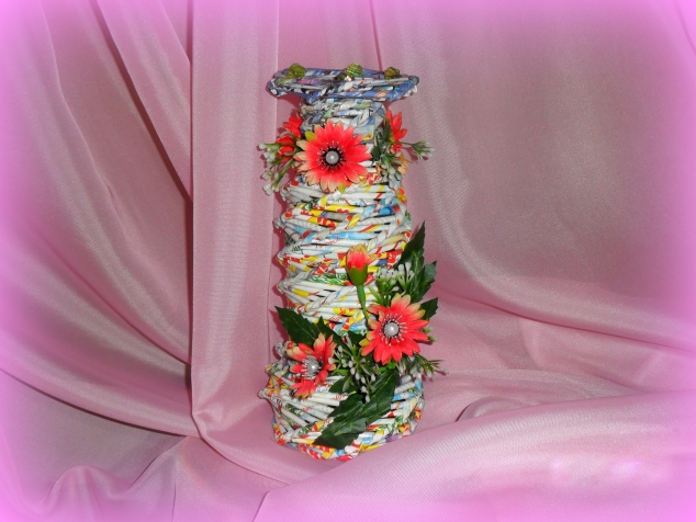 Здравствуйте,дорогие рукодельницы.Хочу показать вам вазочку,сплетённую из журнальных трубочек.В неё можно поставить как сухостой,так и живые цветочки.Вазочку сплела подруге на день рождения,так как она категорически отказывается от покупных подарков.Работа заняла около часа,плюс время на грунтовку и лак.Всего получились,с просушкой и декором ,сутки.Вазочка сплетена спиральным плетением,внутри-пластиковая молочная бутылка с широким горлышком.