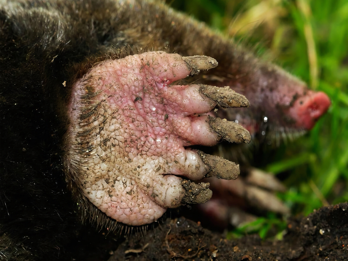 Лапы у крота вывернуты ладонями наружу, как у пловца брассом! На пальцах расположены острые когти, а развитая мускулатура крепится к атлетического вида груди. Скорость рытья в мягкой земле может достигать 30 см в минуту! А за одну ночь опытный крот способен прорыть до 50 м туннеля.