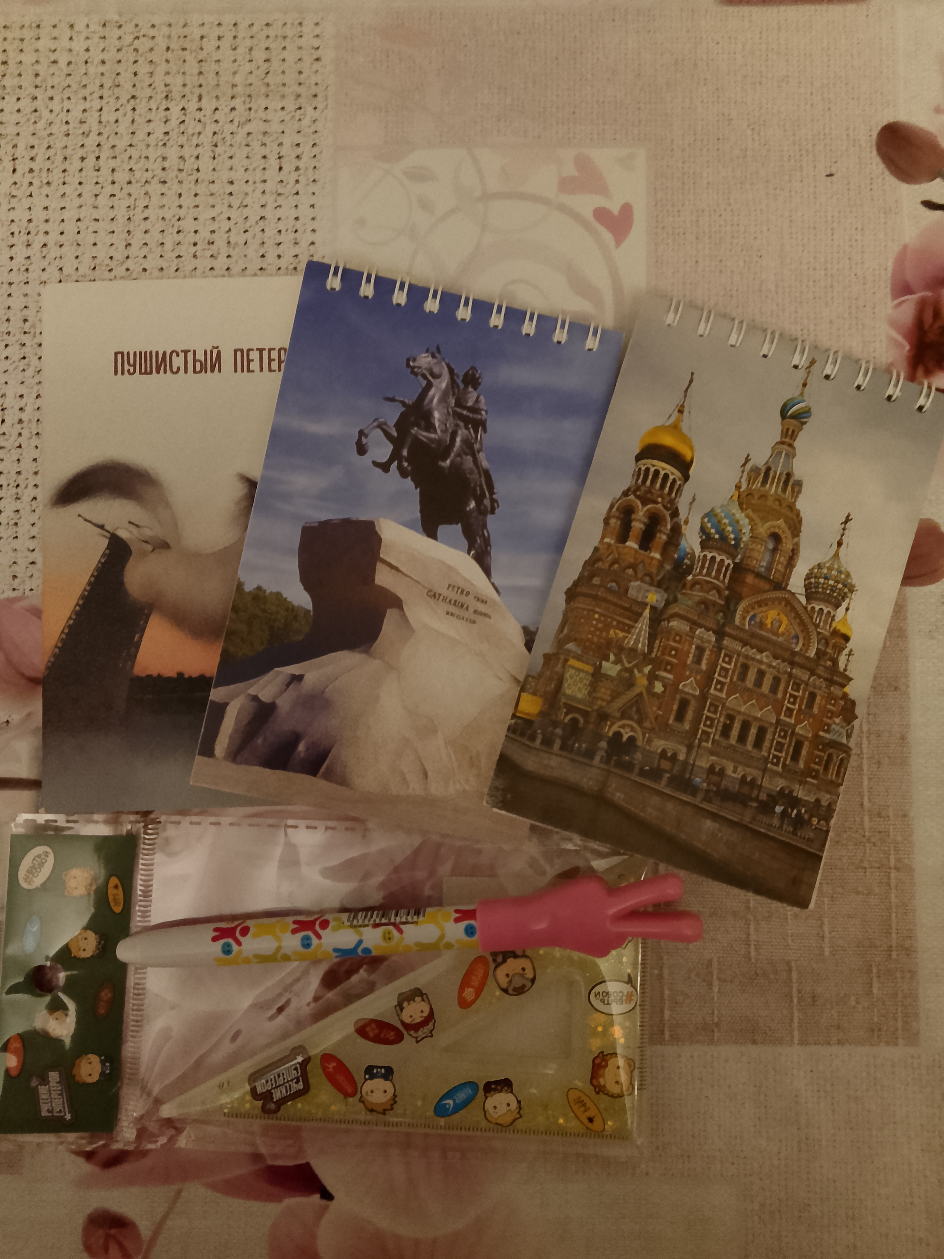 Куча блокнотов, угольник и ручка - передам Насте, когда появится. Девочка уже живёт отдельно и учится в колледже.
