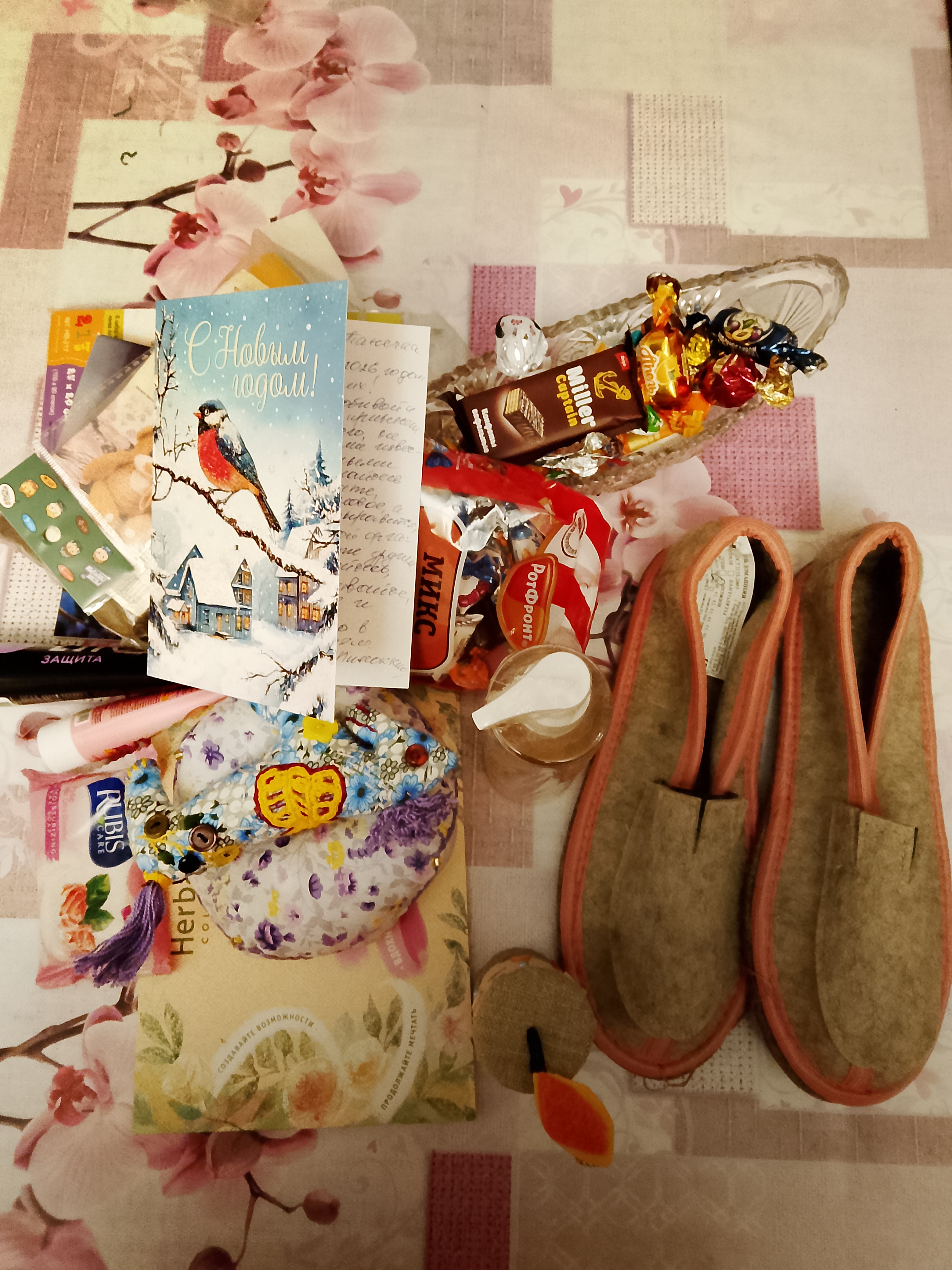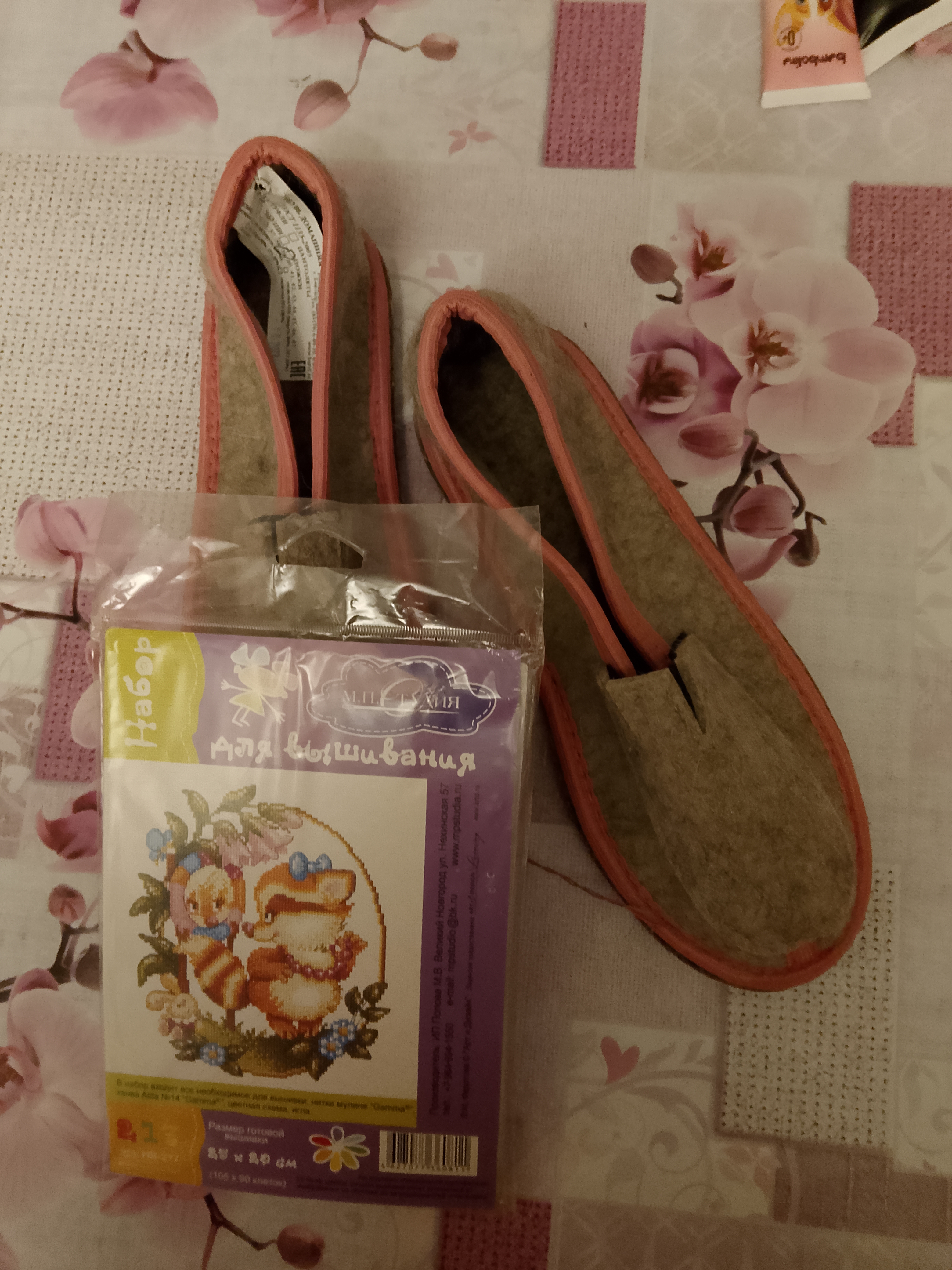 Набор для вышивки и войлочные тапки. Тапки велики по размеру, но не сильно. У меня уже были войлочные и это огромное удовольствие одевать их босяком. Были мои любимые. Уверена, что эти тоже будут такими же комфортными.