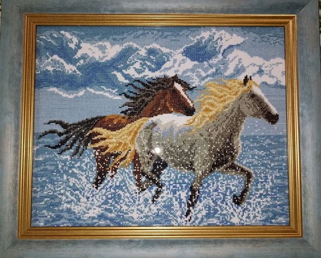 И вот моя вышивка готова. Осталось оформить её в раму. Белые незашитые крестики создают эффект разлетающихся морских брызг из-под копыт бегущих лошадей.