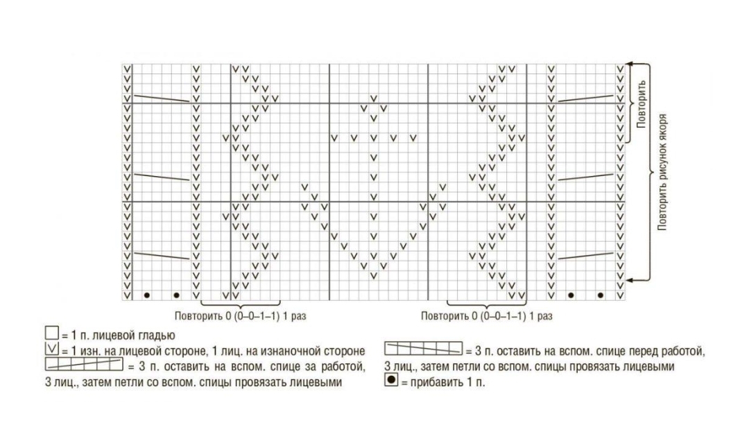 Резинка. Кромочная, попеременно 1 лицевая, 1 изнаночная, кромочная; в изнаночных рядах все петли вязать по рисунку.