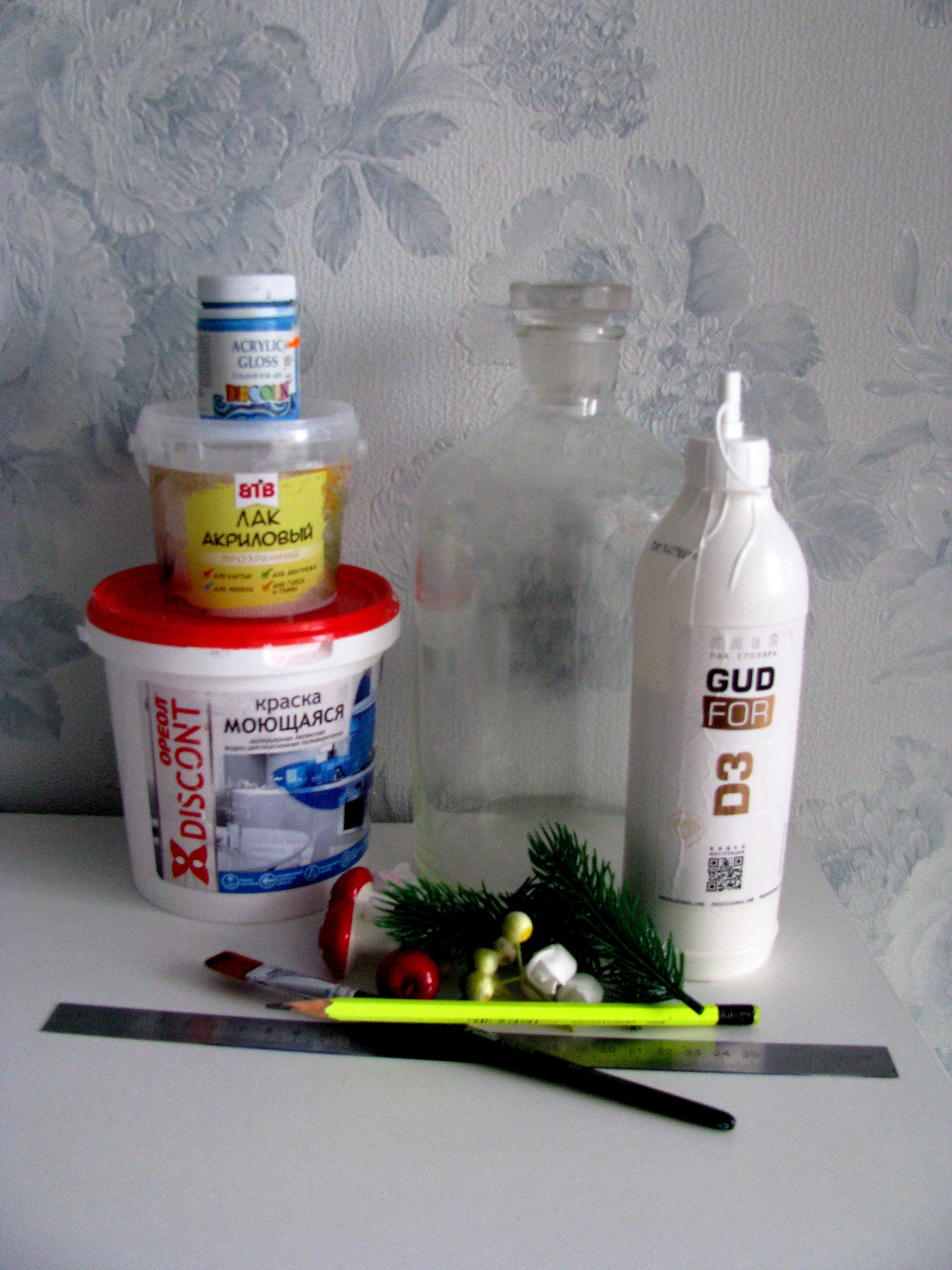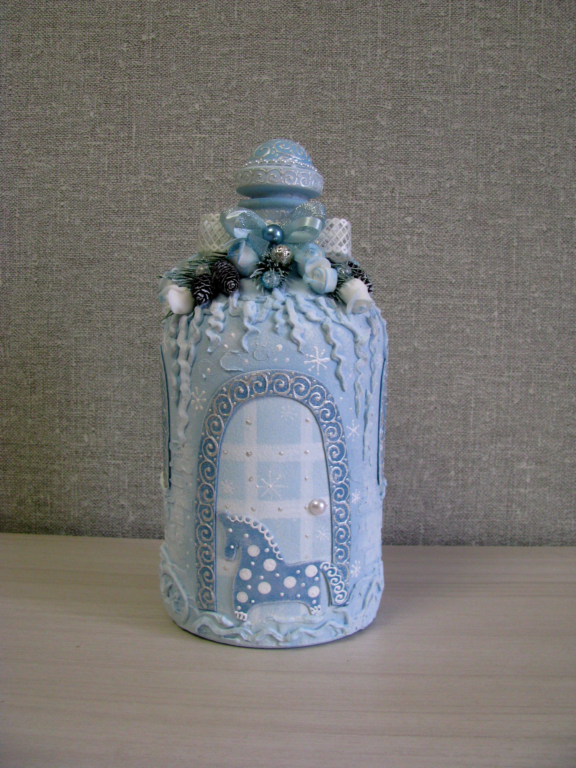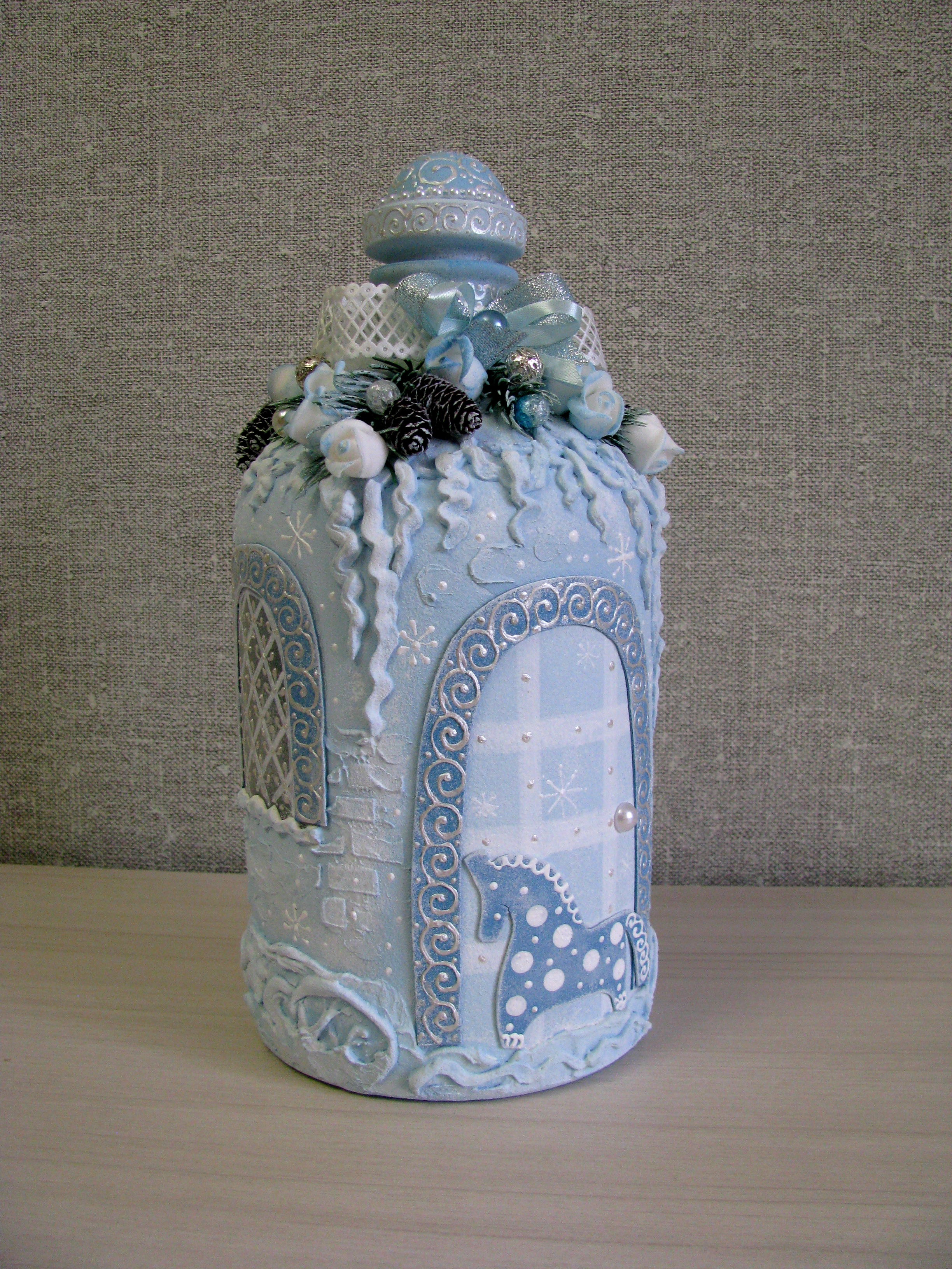 Давно я не декорировала бутылки, решила тряхнуть стариной. Идея домика окончательно созрела, работа закипела, и родился сказочный домик, с крышей из еловых веток с шишками, украшенных цветами, бусинами, лентами. Расписные наличники вокруг окон и двери, витражные окна с перламутровым серебристым узором и, конечно, лошадка у входа в дом.