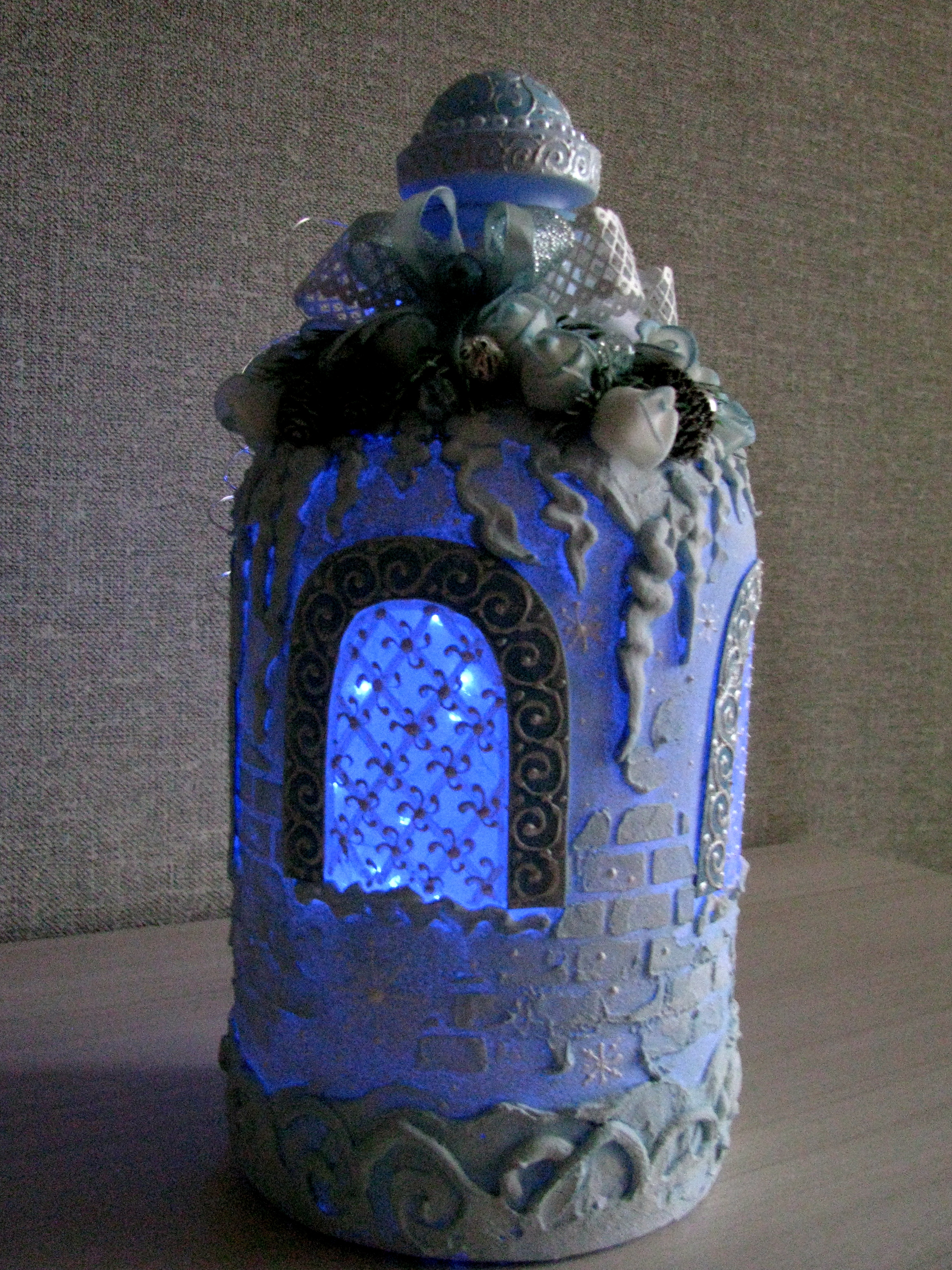 До чего же он хорош! Ледяной сказочный терем для Снегурочки. Даже свет в окошке холодный голубой! Продумана и мастерски выполнена каждая деталь. Алла, меня очень впечатлила Ваша работа!