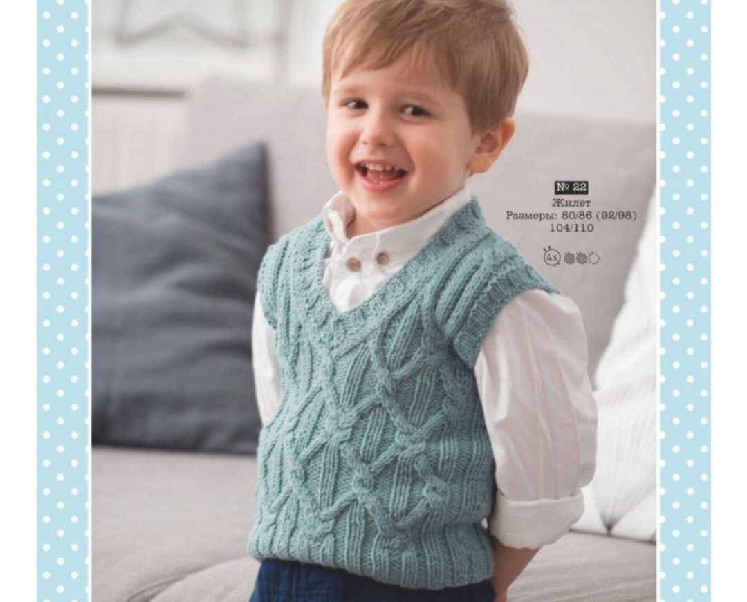 На спицы № 4,5 набрать 58(62)66 п. и связать для планки 3,5 см резинкой, при этом в 1 р. (=изн. ряд) начать после кромочной с 1 изн., 2 лиц., 2 изн.( 1 лиц.,2 изн., 2 лиц.) 1 изн.,2 лиц., 2 изн. и закончить симметрично. Затем петли распределить следующим образом: кром., 1п. лиц. глади, 2 п. изн. глади, 50 п. узора с «косами», начиная с 7-го р., 2 п. изн. глади, 1 п. лиц. глади, кром. (кром., 1 п. изн. глади, 2 п. лиц. глади, 2 п. изн. глади, 50 п. узора с «косами», 2 п. изн. глади, 2 п. лиц. глади, 1 п. изн. глади, кром.) кром., 1 п. лиц. глади, 2 п. изн. глади, 2 п. лиц. глади, 2 п. изн. глади, 50 п. узора с «косами», начиная с 23-го р., 2 п. изн. глади, 2 п. лиц. глади, 2 п. изн. глади, 1 п. лиц. глади, кром. Через 21(22)23 см от начального ряда закрыть с обеих сторон для пройм 1 х 3 п. и в каждом 2-м р. 1 х 2 п. и 2 х 1 п. = 44(48)52 п. Через 30,5(32,5)34,5 см от начального ряда закрыть для выреза горловины средние 14(16)18 п. и обе стороны закончить раздельно. Для закругления горловины закрыть по внутреннему краю в каждом 2-м р. 1 х 2 п. и 1 х 1 п. Через 32,5(34,5) 36,5 см от начального ряда закрыть оставшиеся 12(13)14 п. Вторую сторону закончить симметрично.