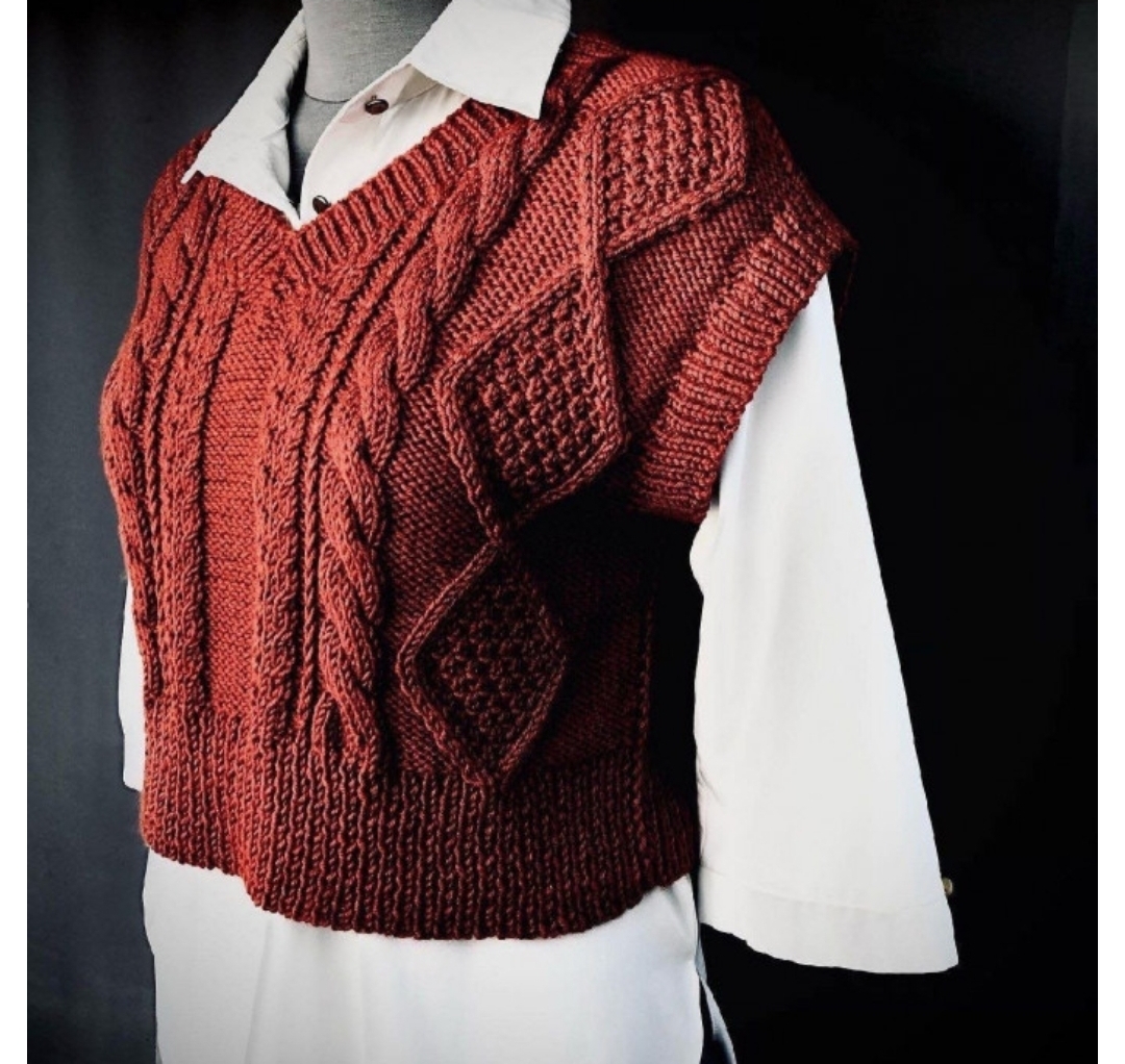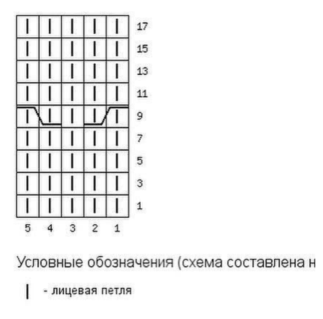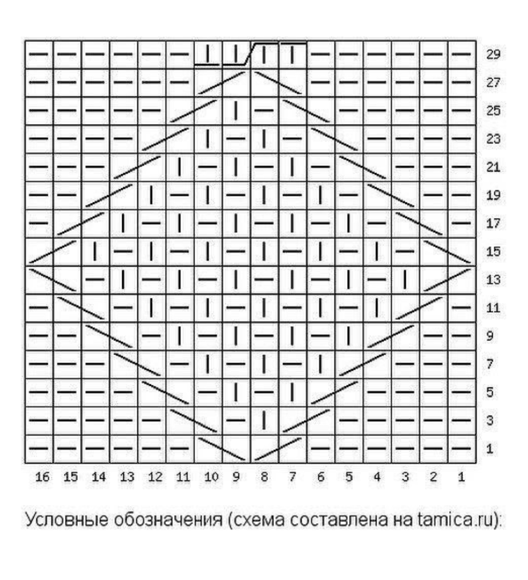 Раскладка узора: 1 кром., 6 изн., 18п. Ромба, 2 изн., 7 (8)п. -коса, 2 изн., 1 снятая петля, 2 изн., 5 п. -жгутик, 9 изн., 5п.-жгутик, 2 изн., 1 снятая петля, 2 изн., 7(8) п.-коса, 2 изн., 18 п.-ромб, 6 изн., 1 кром.
