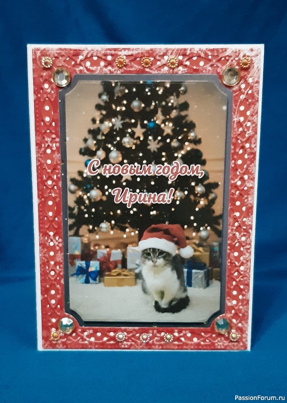 Чтобы открытка буквально светилась, я добавила крупные стразы по углам и мелкие золотистые детали по периметру. Они переливаются на свету, как настоящие елочные игрушки!