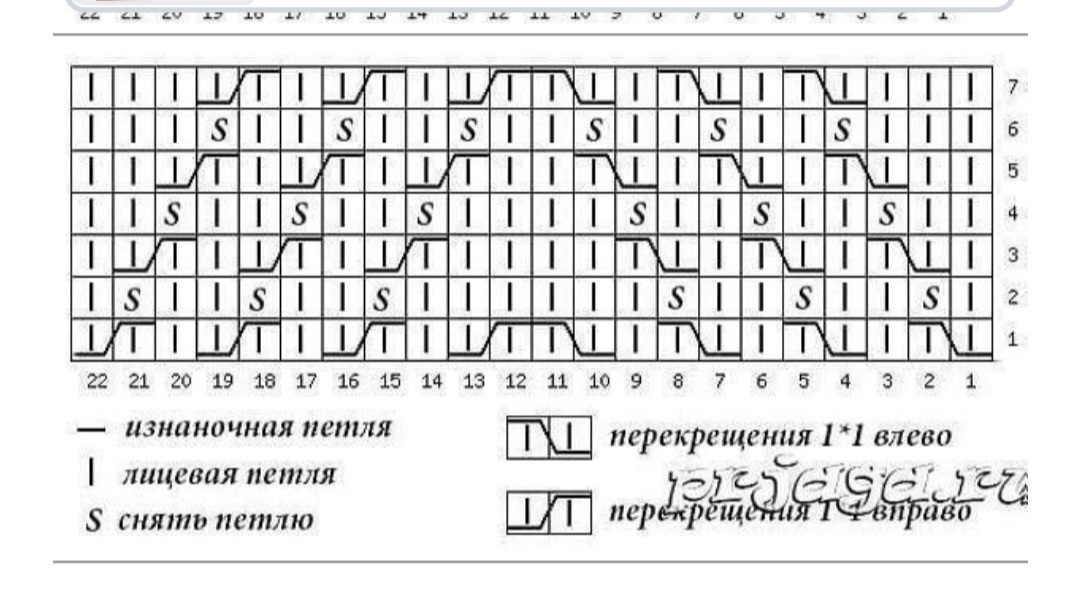 Далее вязать: 12 лиц., 1 изн., 22 петли по схеме, 1 изн., 24 лиц., 1 изн., 22 петли по схеме, 1 изн., 12 лиц.