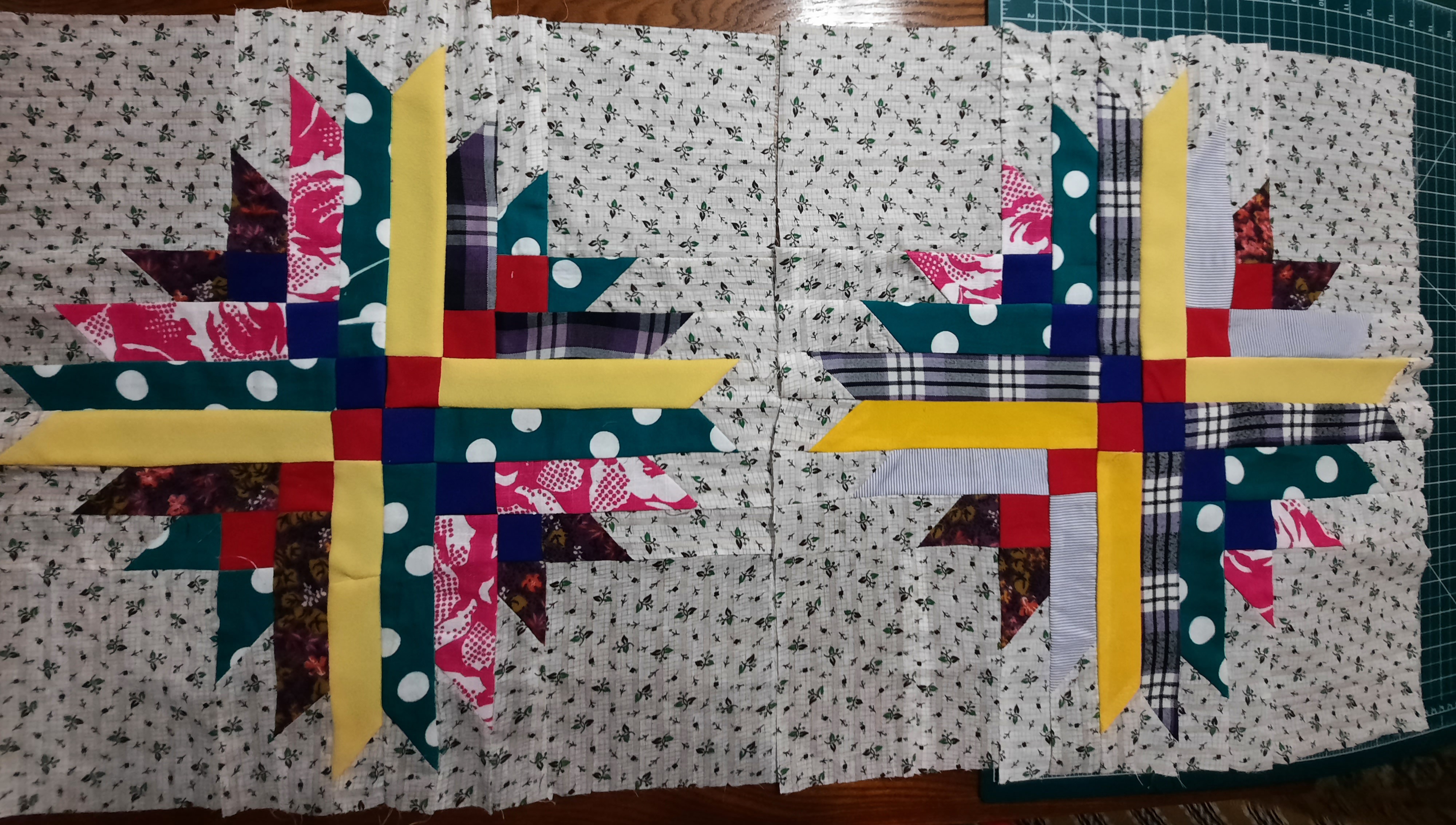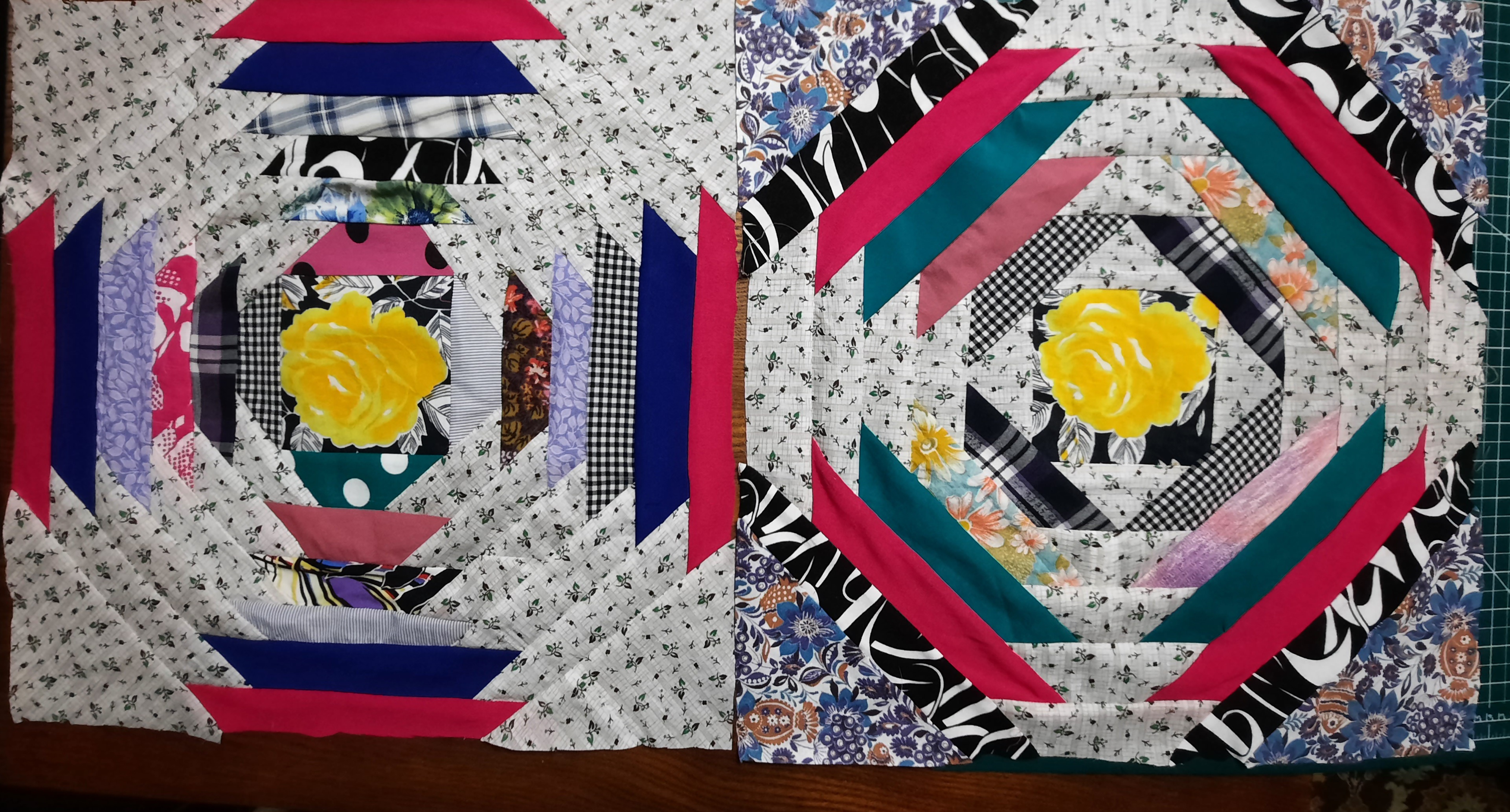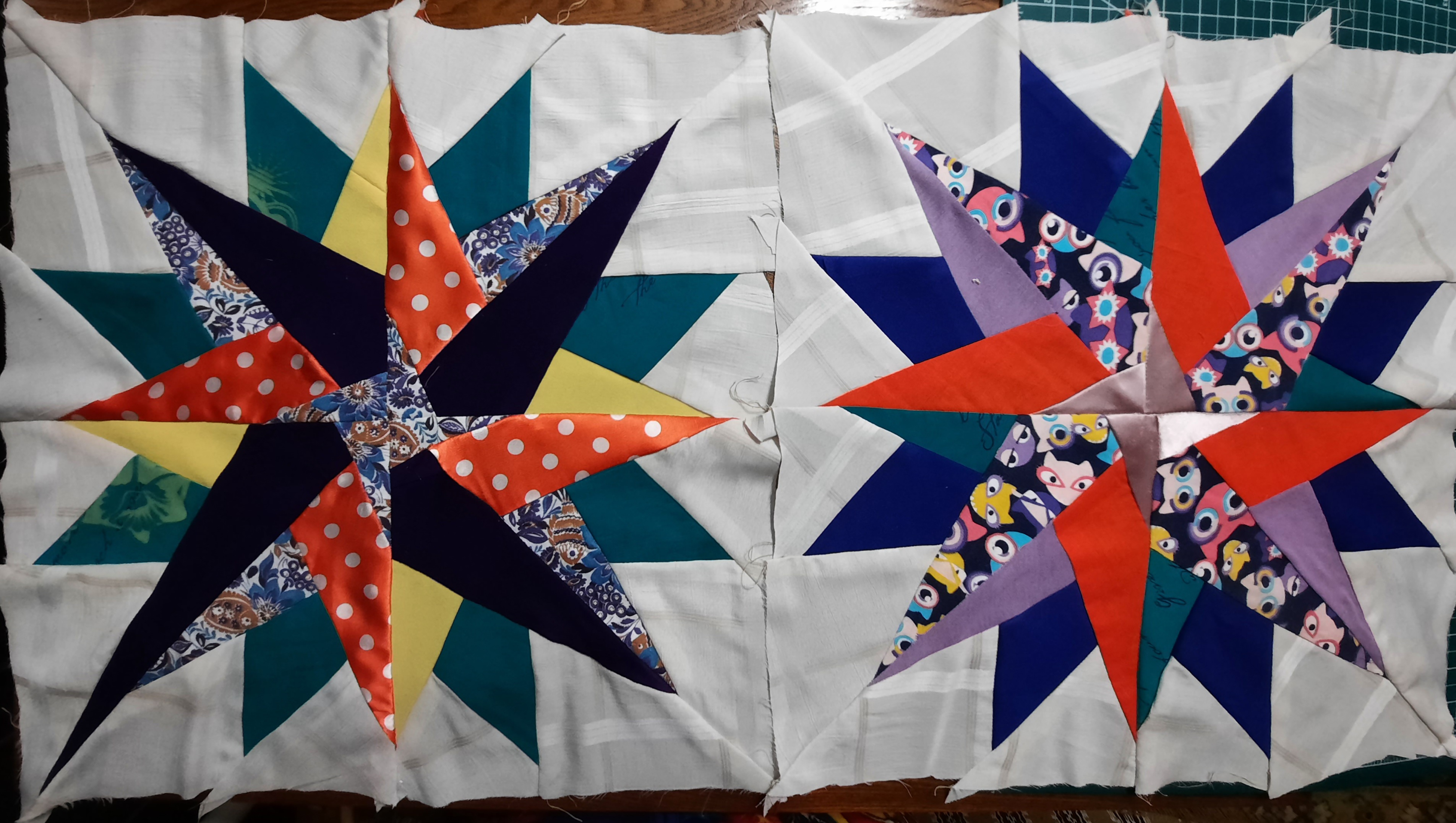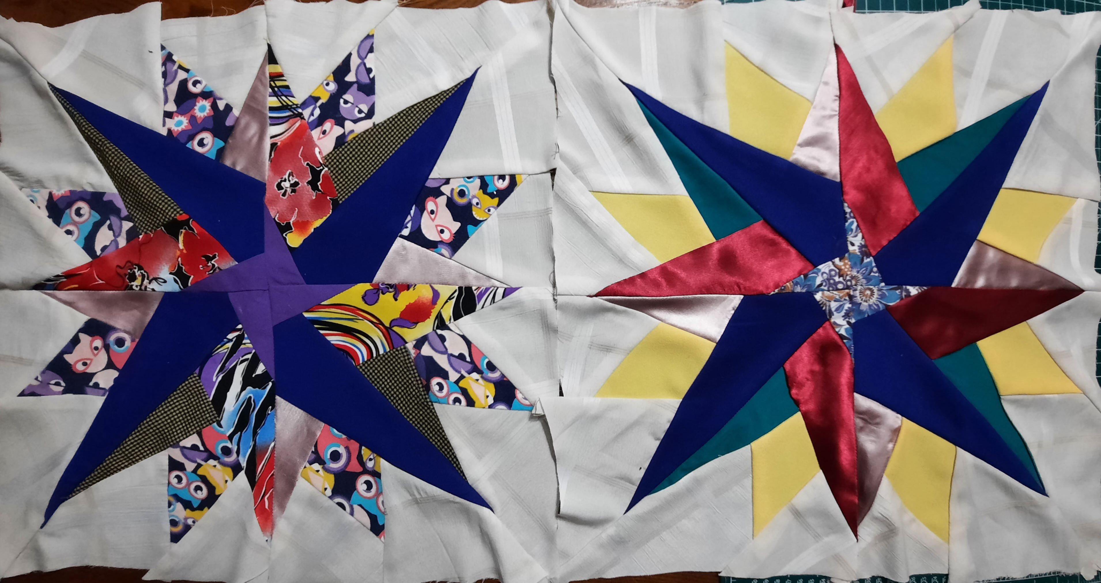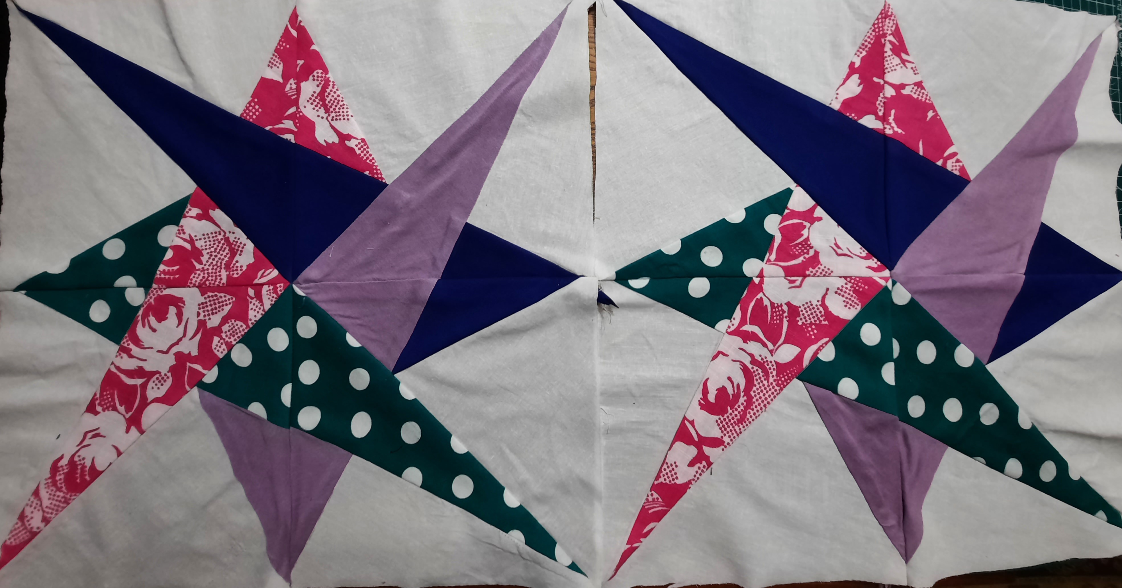 Готовлю к пошиву очередное одеяло.Для каждого нового одеяла разрабатываются новые блоки,стараюсь не повторяться.Даже одинаковая схема блока решается в разном цветовом исполнении . Выравнивание блоков будет перед стежкой сэндвичей.