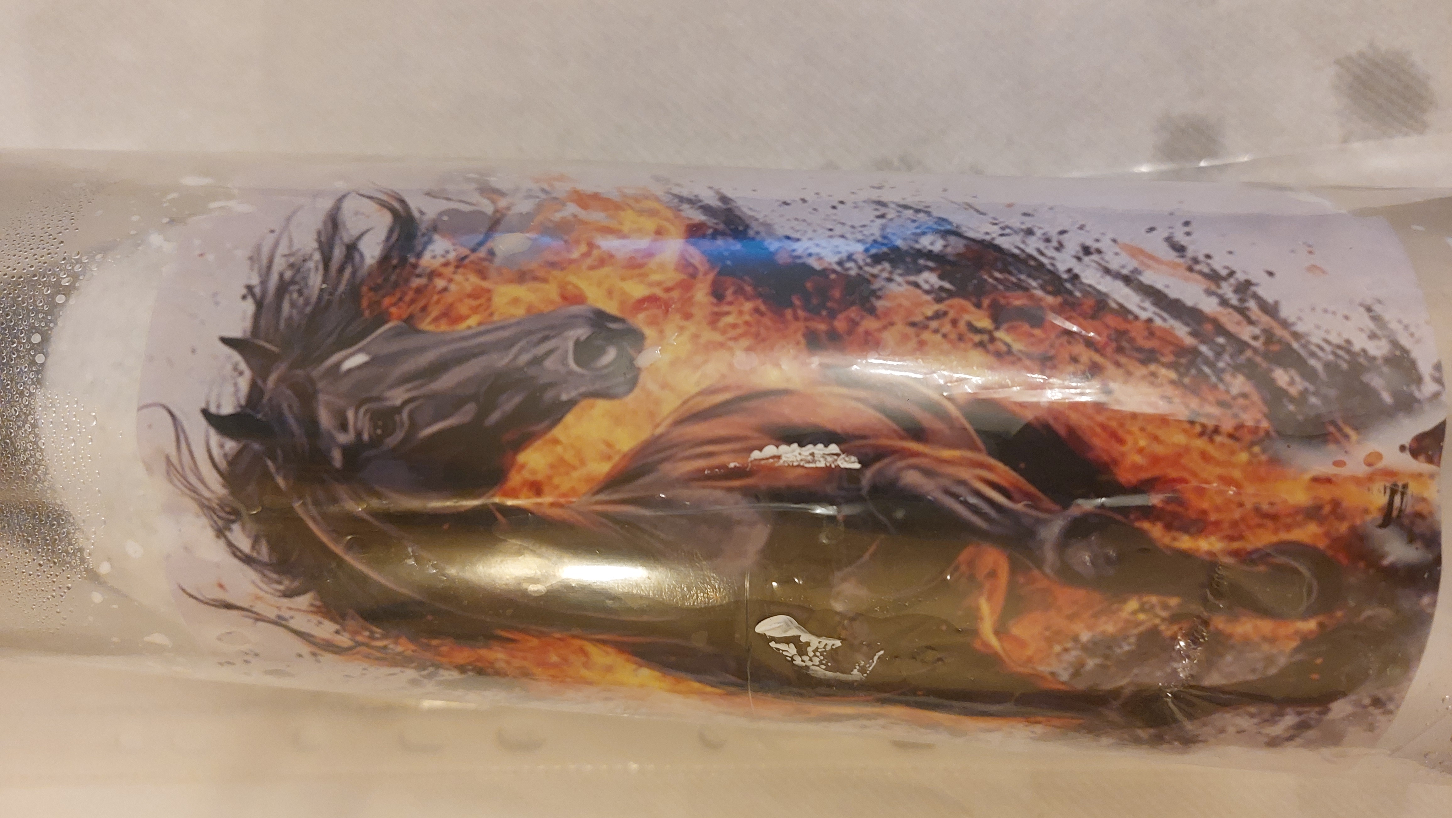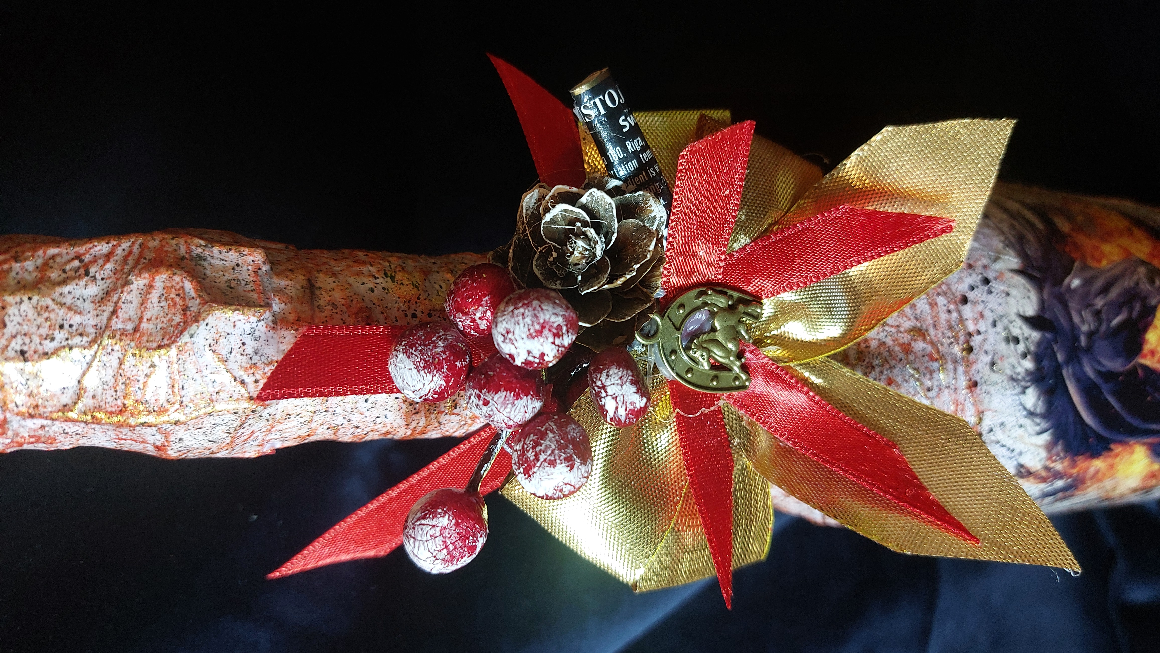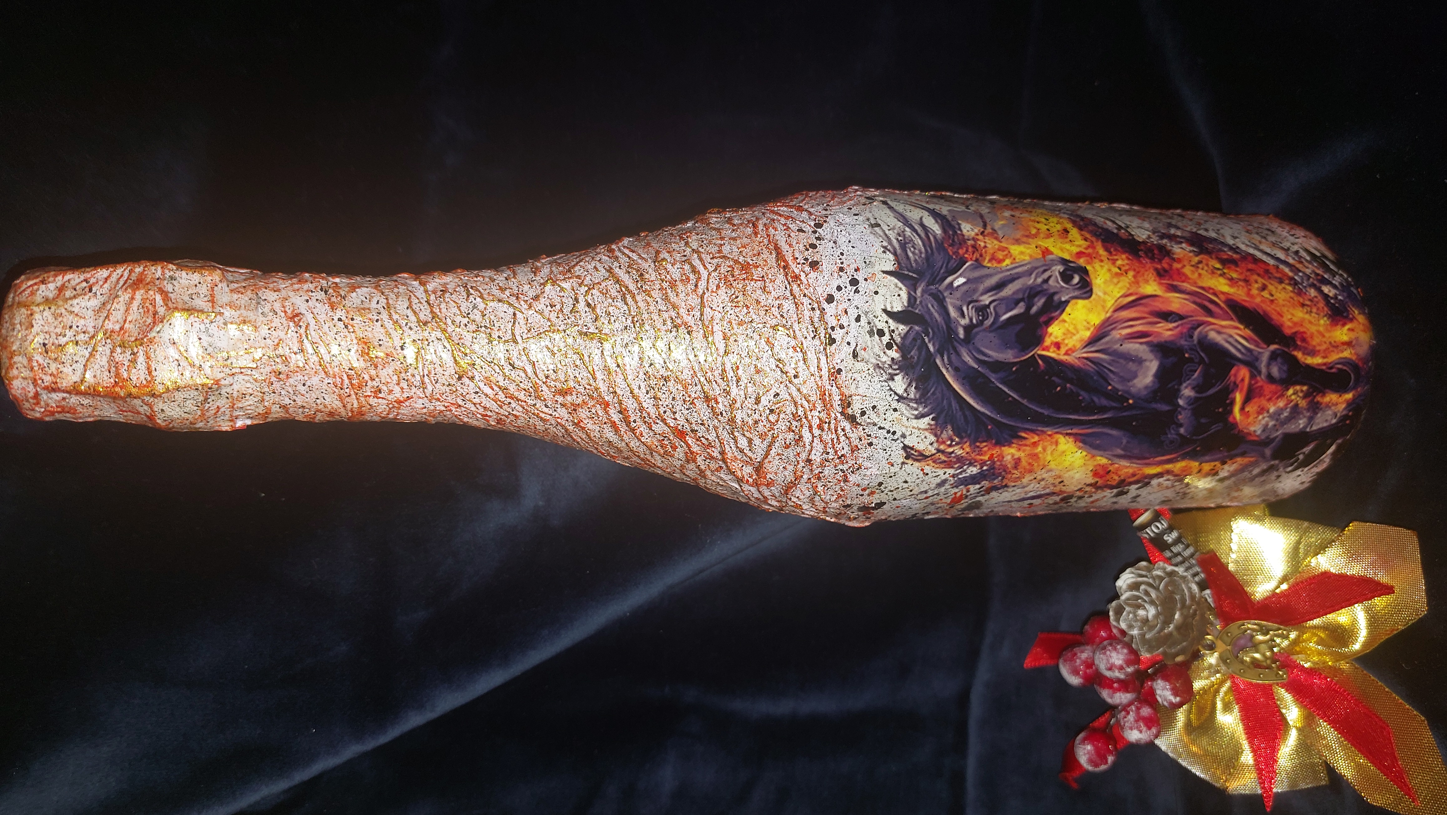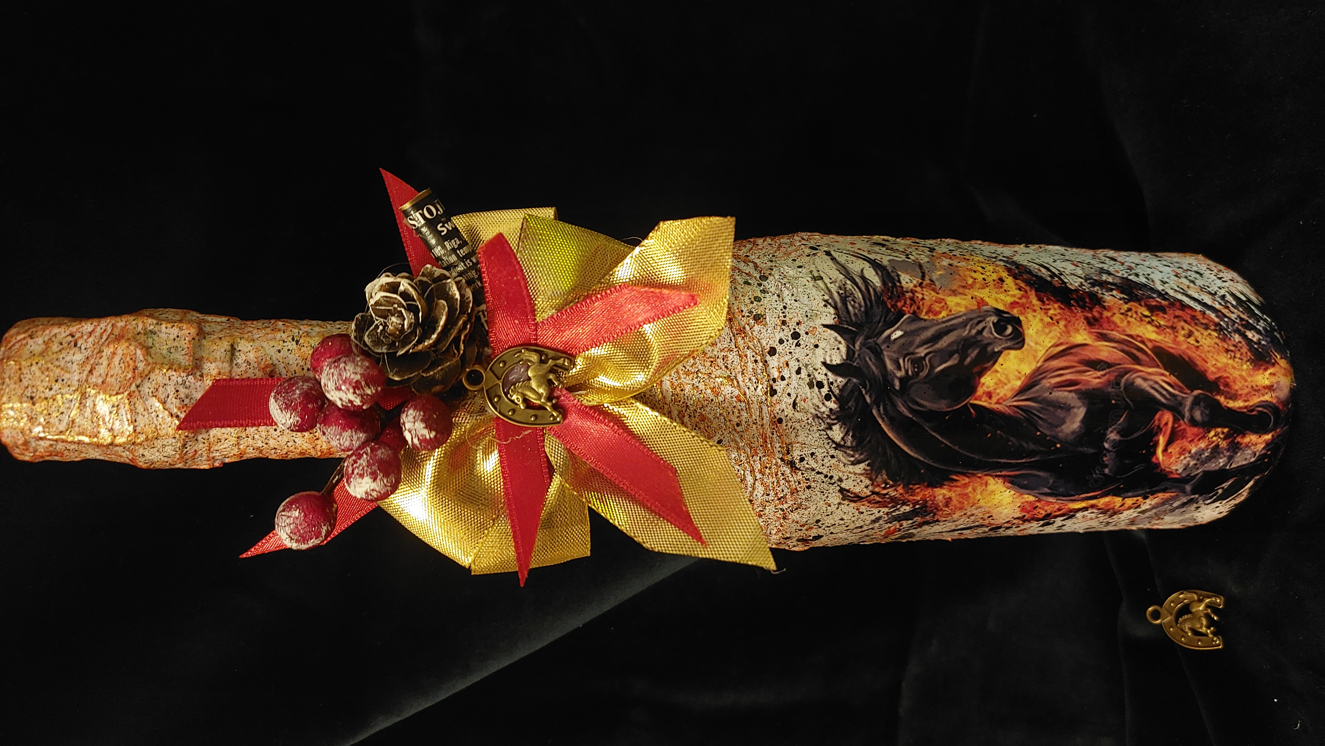 Красные ленты символизирут огонь и гармонируют с цветом мотива.Сюда же приклеила этикетку от бутылки для информации о содержимом напитке.