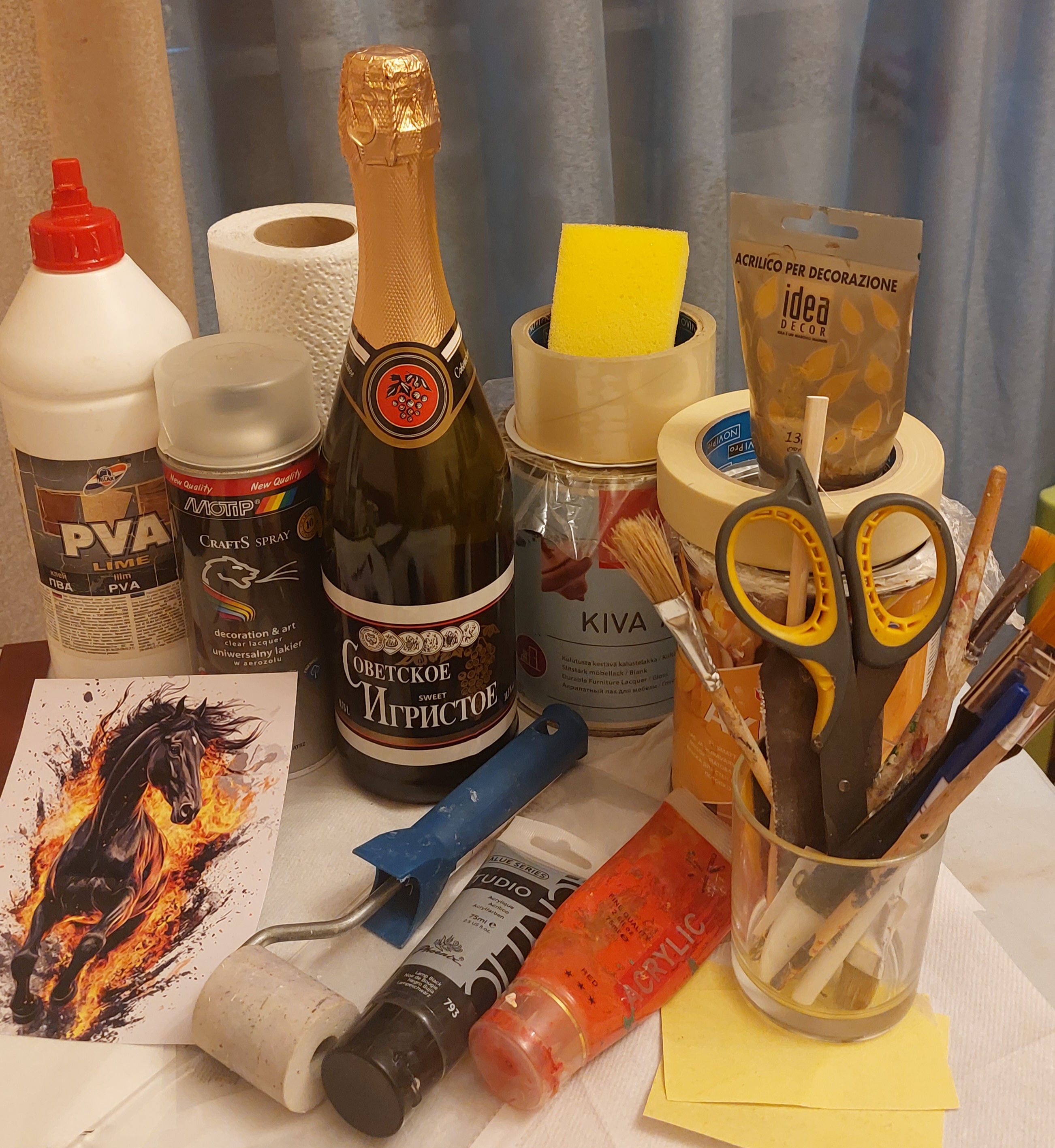 Акриловый лак-Kiva,скотч,линейка,распечатка картинки на фотобумаге,бумажные салфетки или полотенца,клей ПВА,ножницы,кисти,строит.валик,пластик.,канцелярский файл, глянцевый лак спрей с баллончика.
