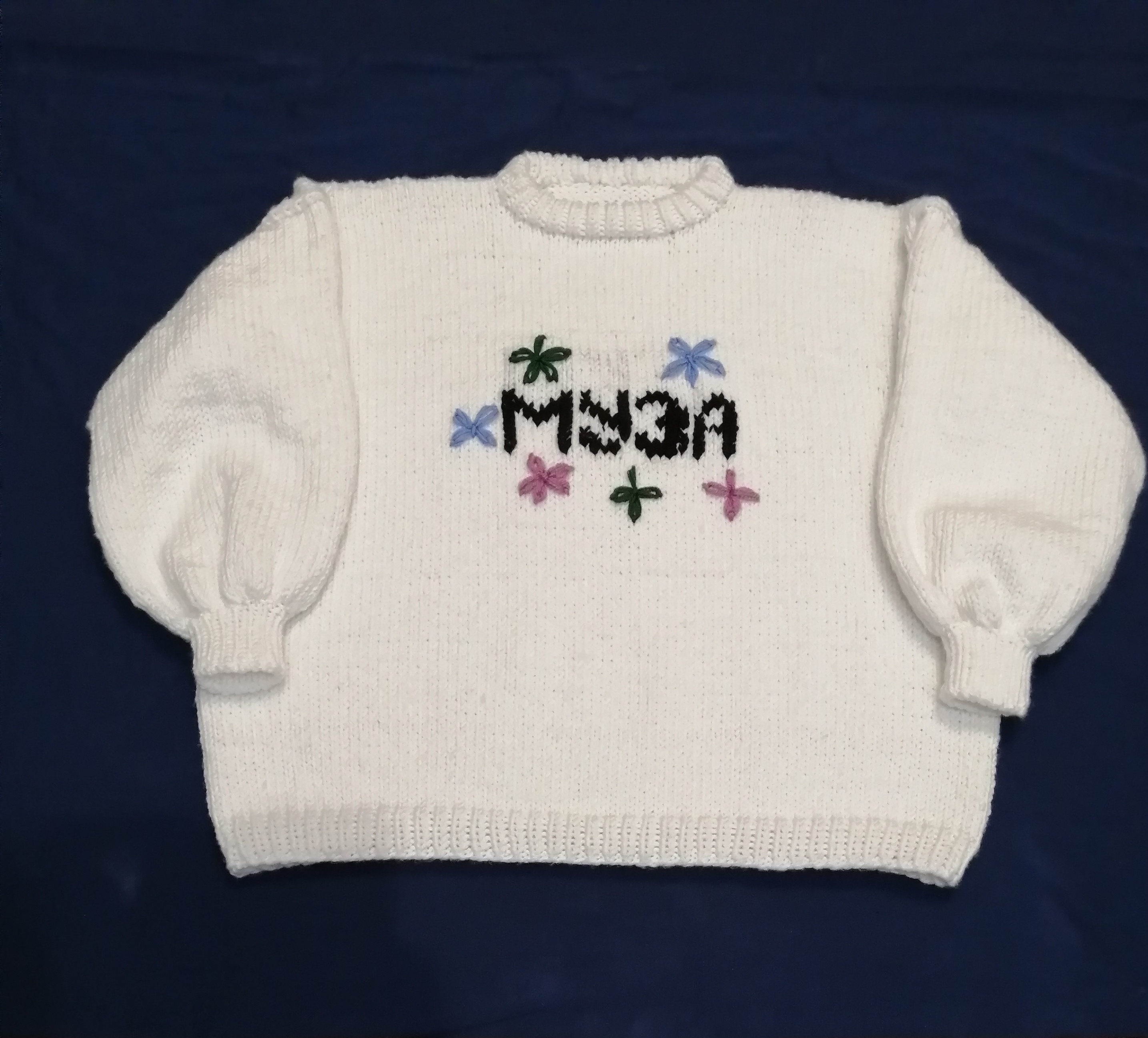 Вязаный свитер с вышивкой по мотивам известного бренда Mirstores. Размер one size.