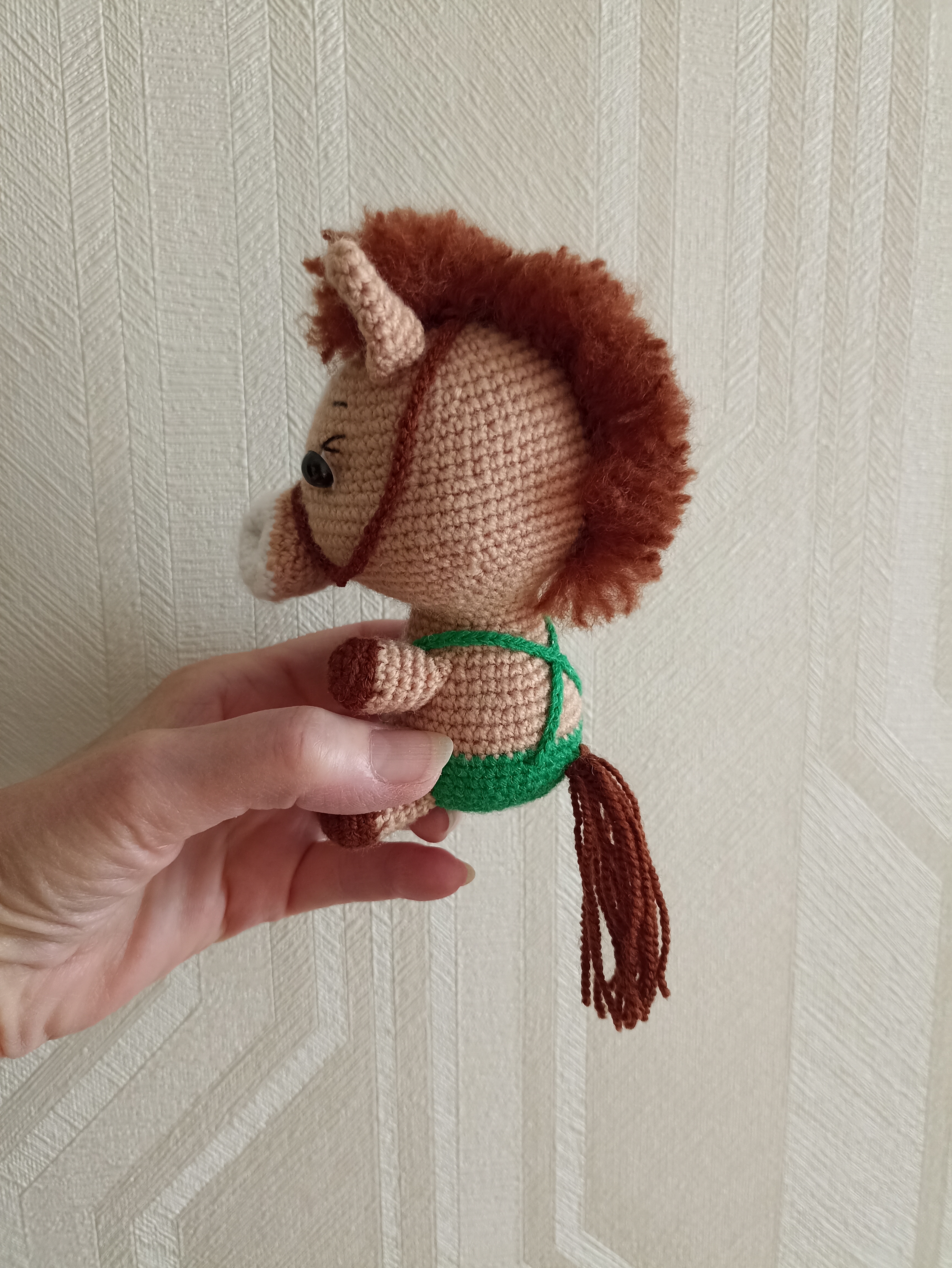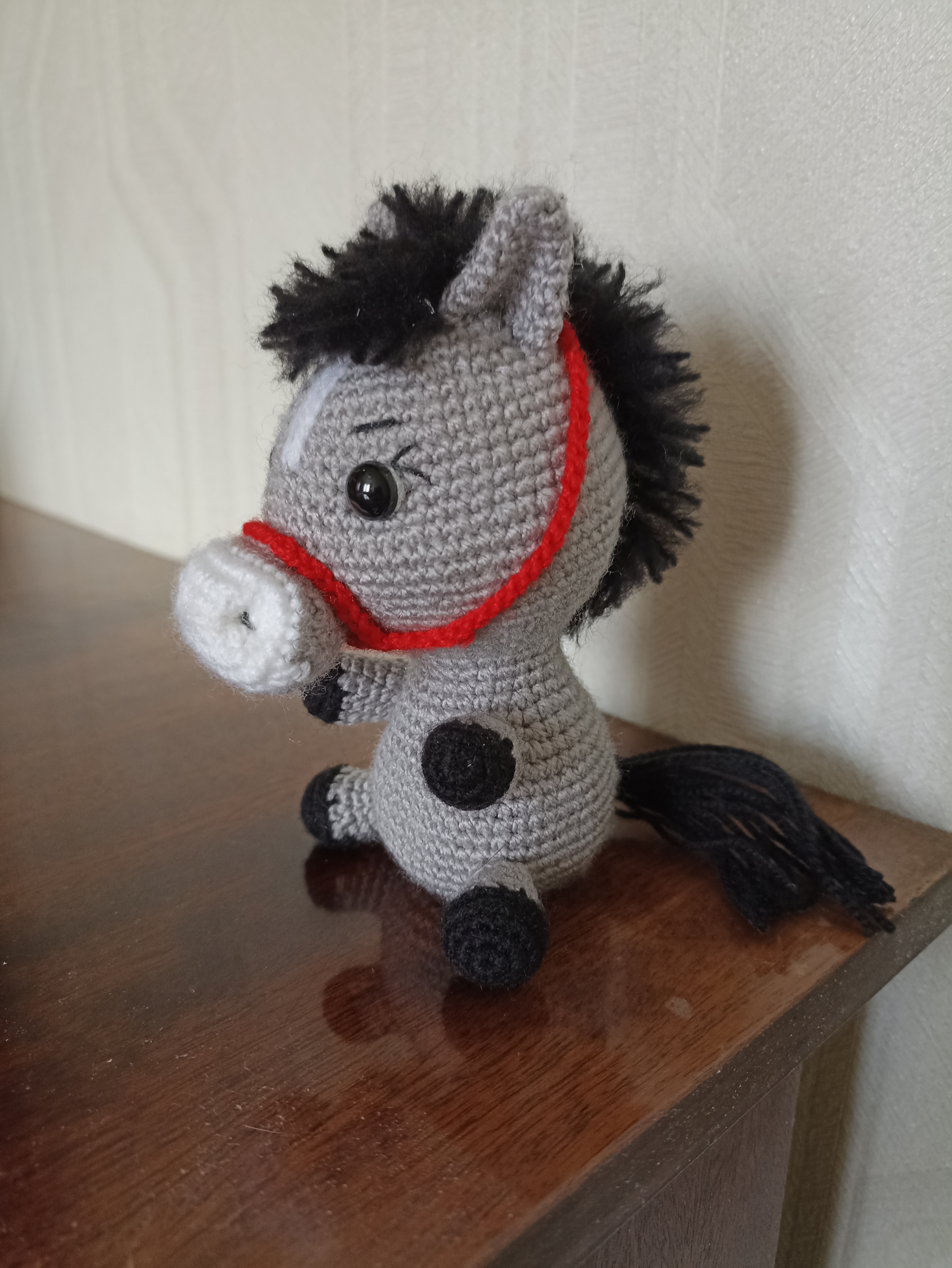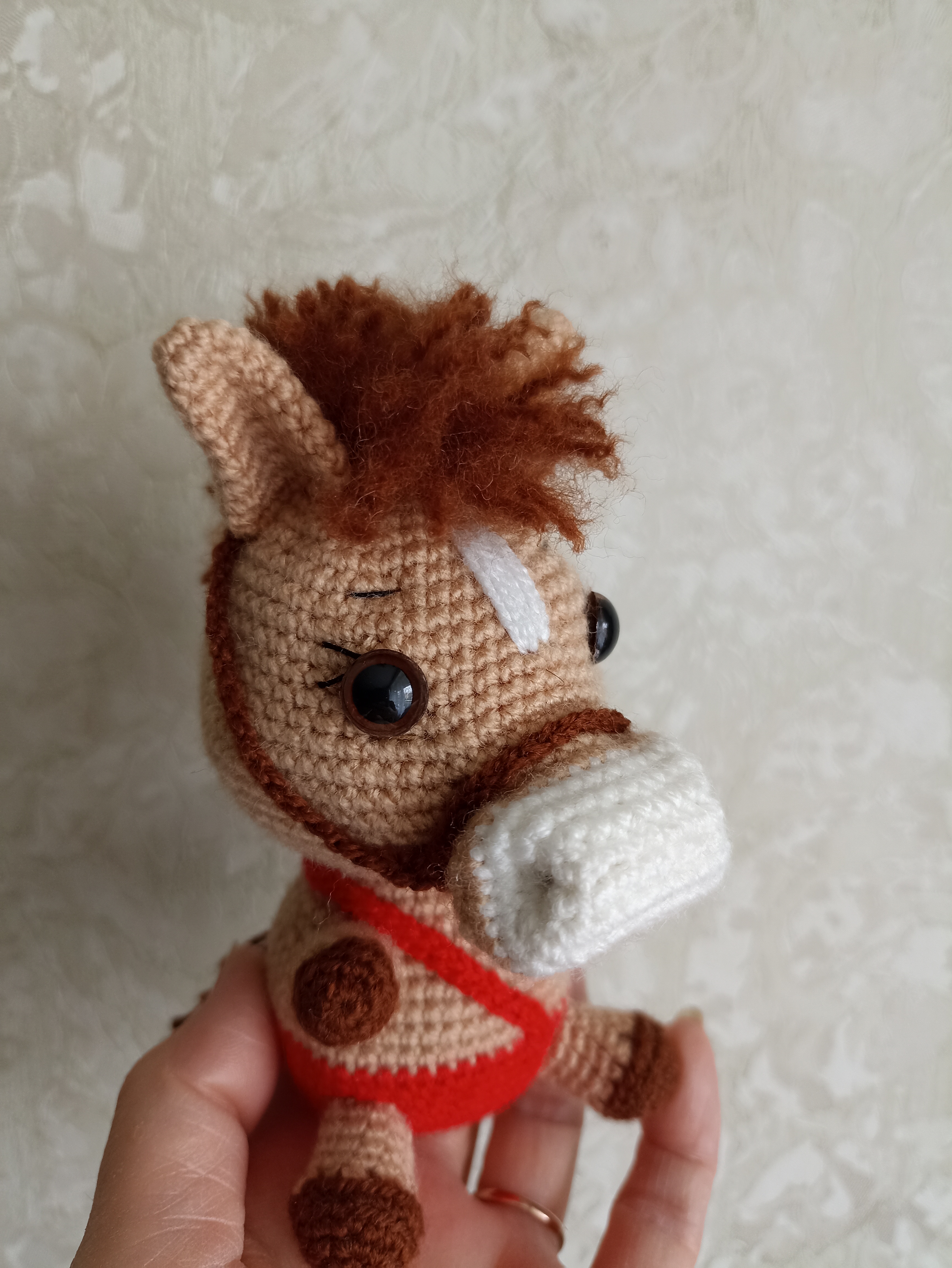 А эта лошадка самая крупная в моём табуне, прямо коняшка, а не лошадка. Наткнулась на просторах интернета на МК- диктант Антонины Дегтярёвой "Коняшка", ну и зачесались руки попробовать связать такого зверя. Не могу сказать, что это работа для начинающей вязальщицы, но, по-моему, результат того стоит, дорогу осилит идущий. Пряжа акриловая, в основном Пчёлка, но и все остатки собирала по закромам. Игрушка получилась около 13 см ростом, мощная такая.