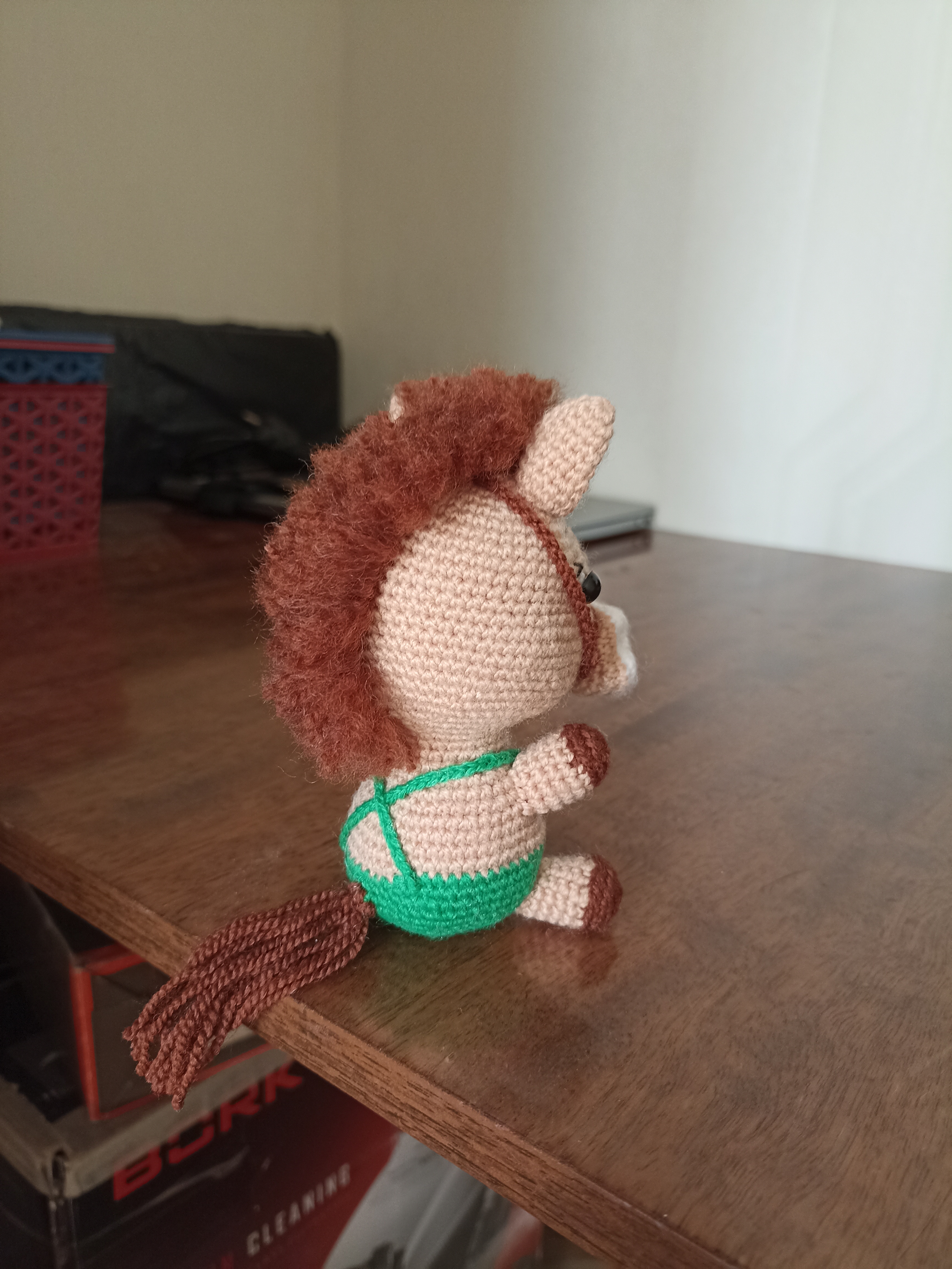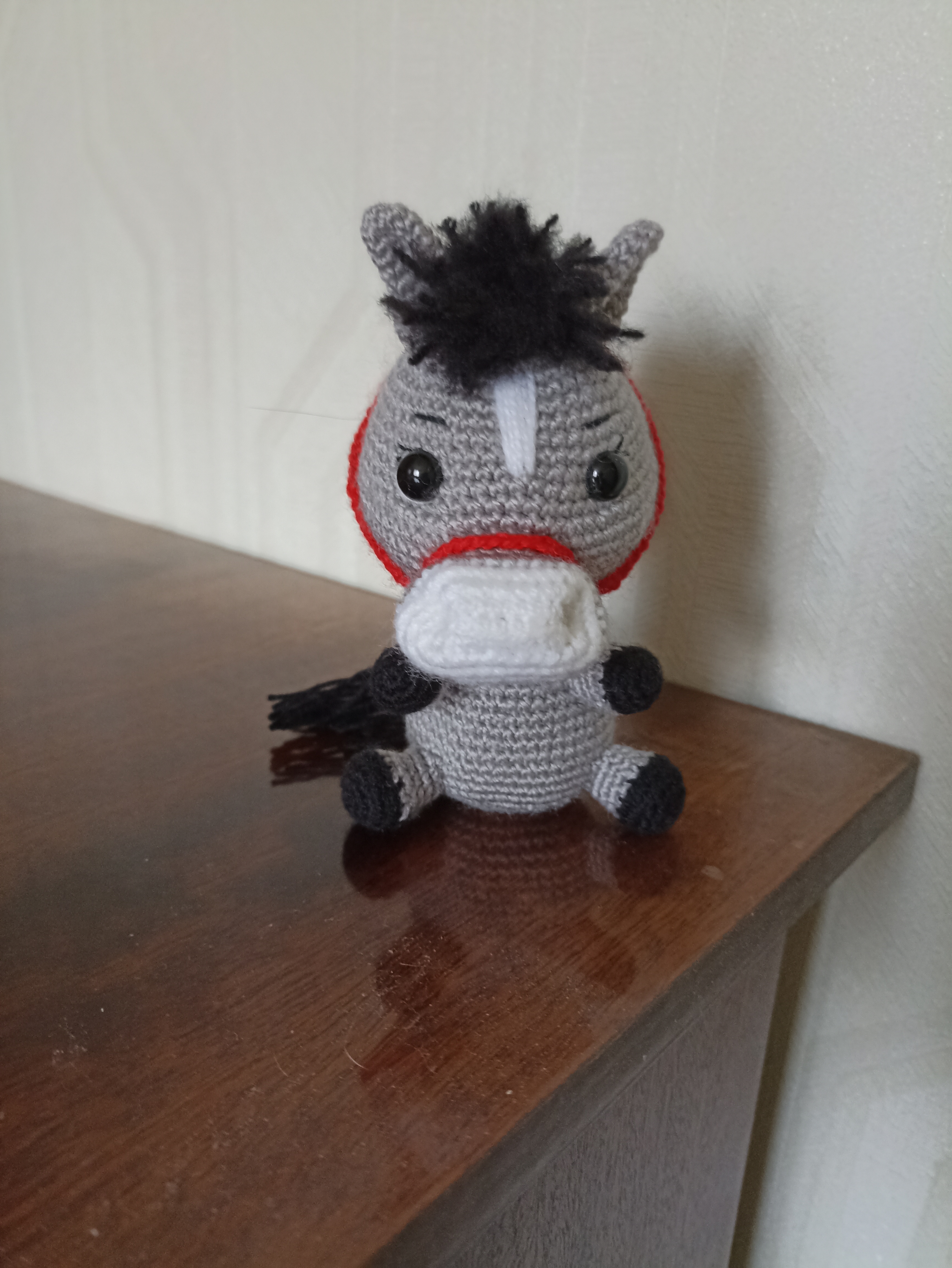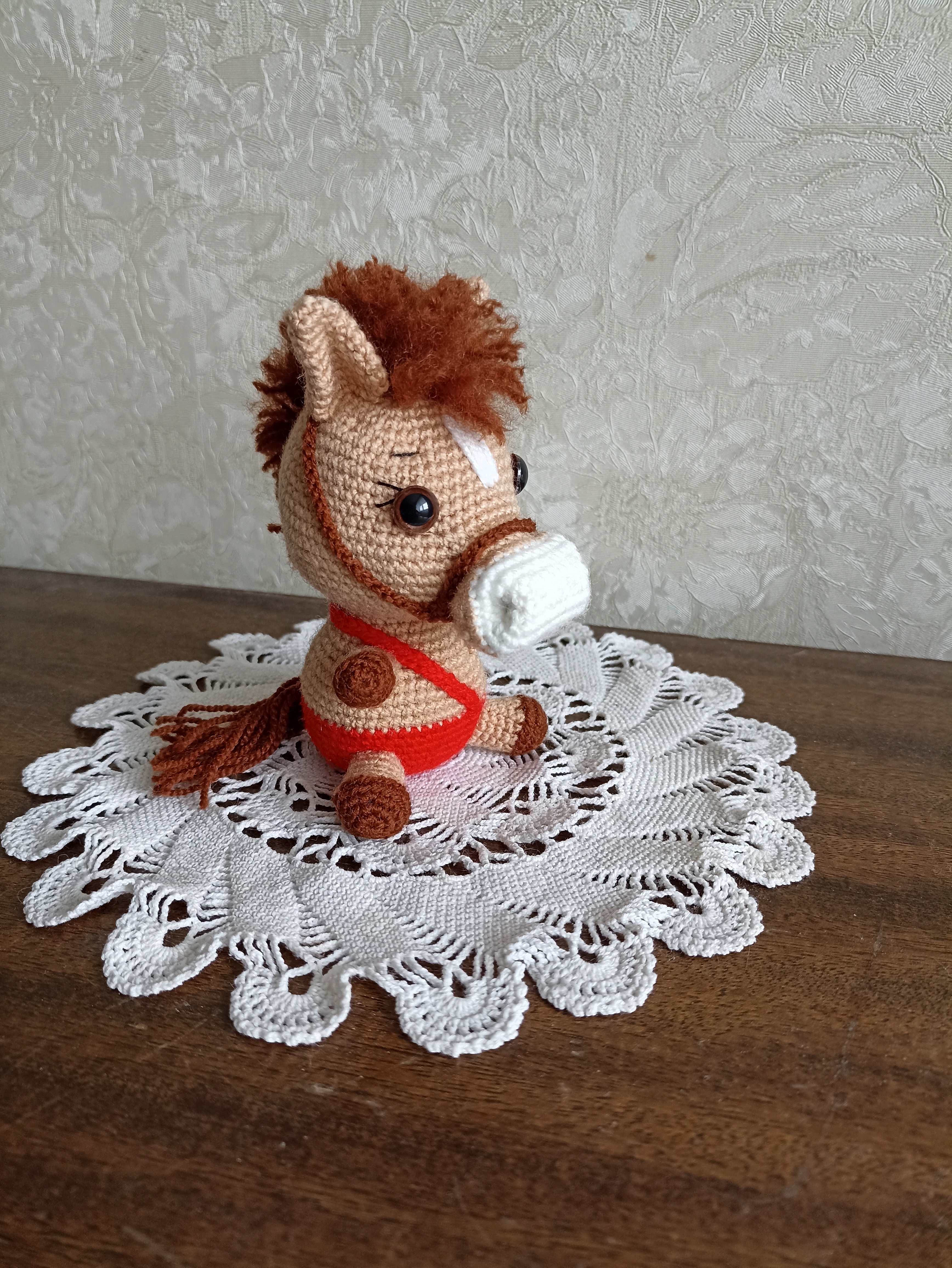 А эта лошадка самая крупная в моём табуне, прямо коняшка, а не лошадка. Наткнулась на просторах интернета на МК- диктант Антонины Дегтярёвой "Коняшка", ну и зачесались руки попробовать связать такого зверя. Не могу сказать, что это работа для начинающей вязальщицы, но, по-моему, результат того стоит, дорогу осилит идущий. Пряжа акриловая, в основном Пчёлка, но и все остатки собирала по закромам. Игрушка получилась около 13 см ростом, мощная такая.