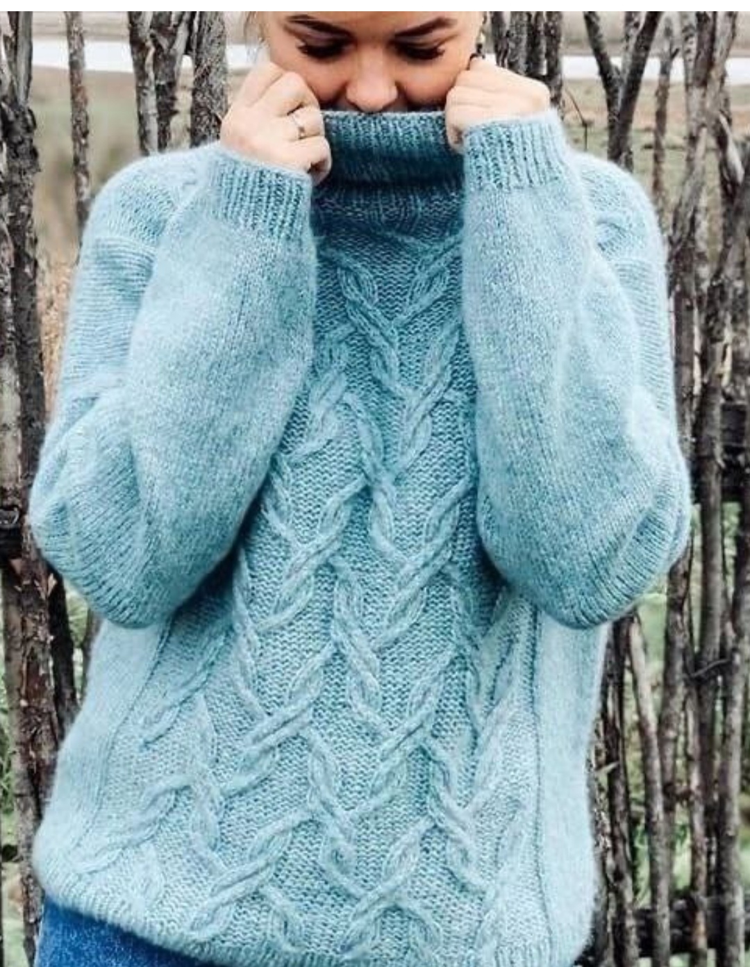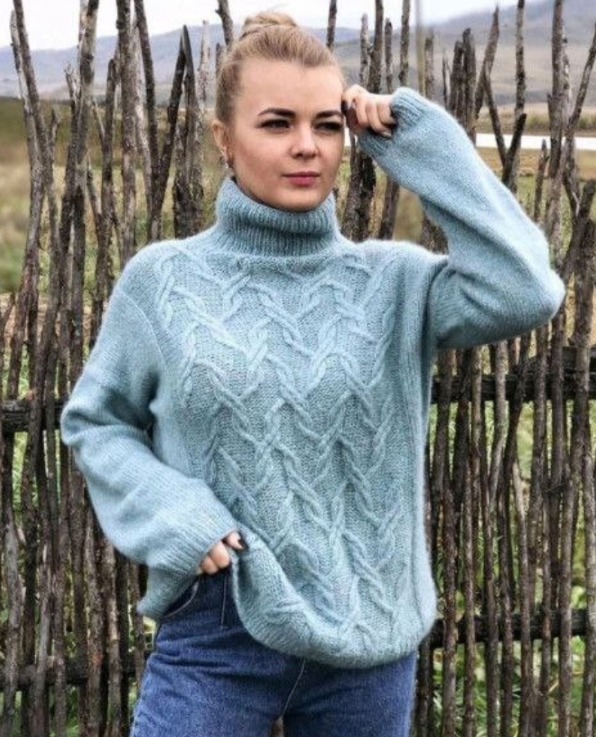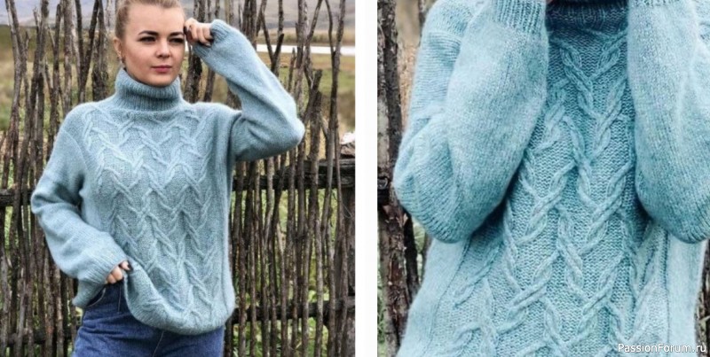 Сшить плечи трикотажным швом. Петли горловины остались открытыми. Из них мы продолжим вязать ворот свитера спицами N4-32 ряда, закрыть петли ворота.
