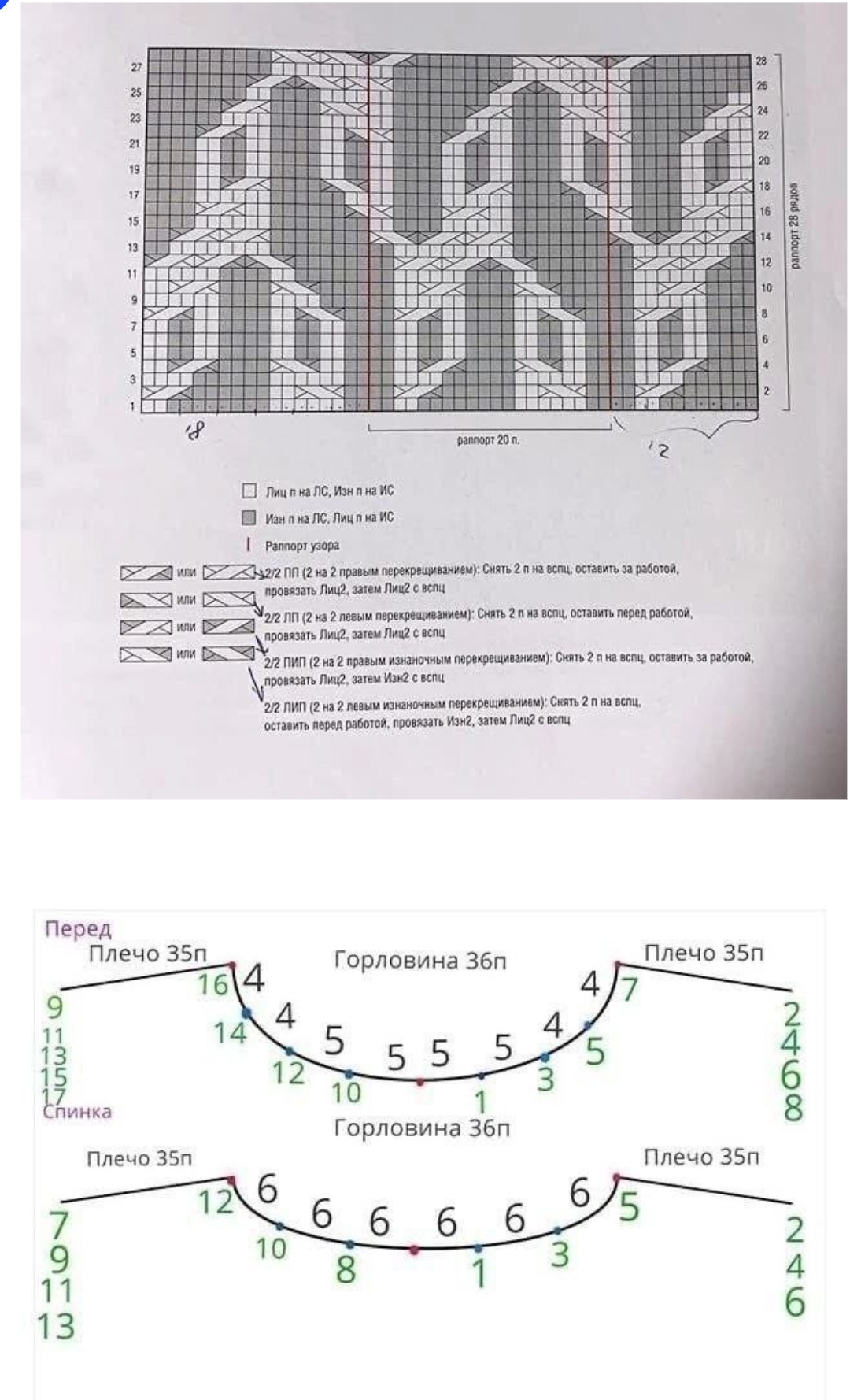Затем формируем горловину укороченными рядами, в карусели схема. Зелёным цветом указаны точки разворота вязания.