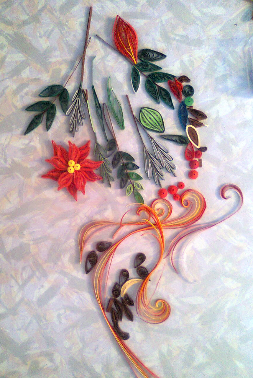7.Зелень: я делала разную. Веточки из ½ полоски диаметром 9мм. Также использованы контурные листья.