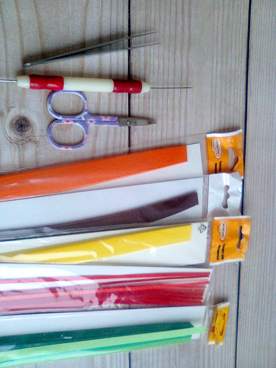 полоски цветной бумаги шириной 3 мм (я покупаю их в магазине), линейка с отверстиями разных диаметров, клей ПВА, ножницы, пинцет и самое главное - игла для квиллинга.