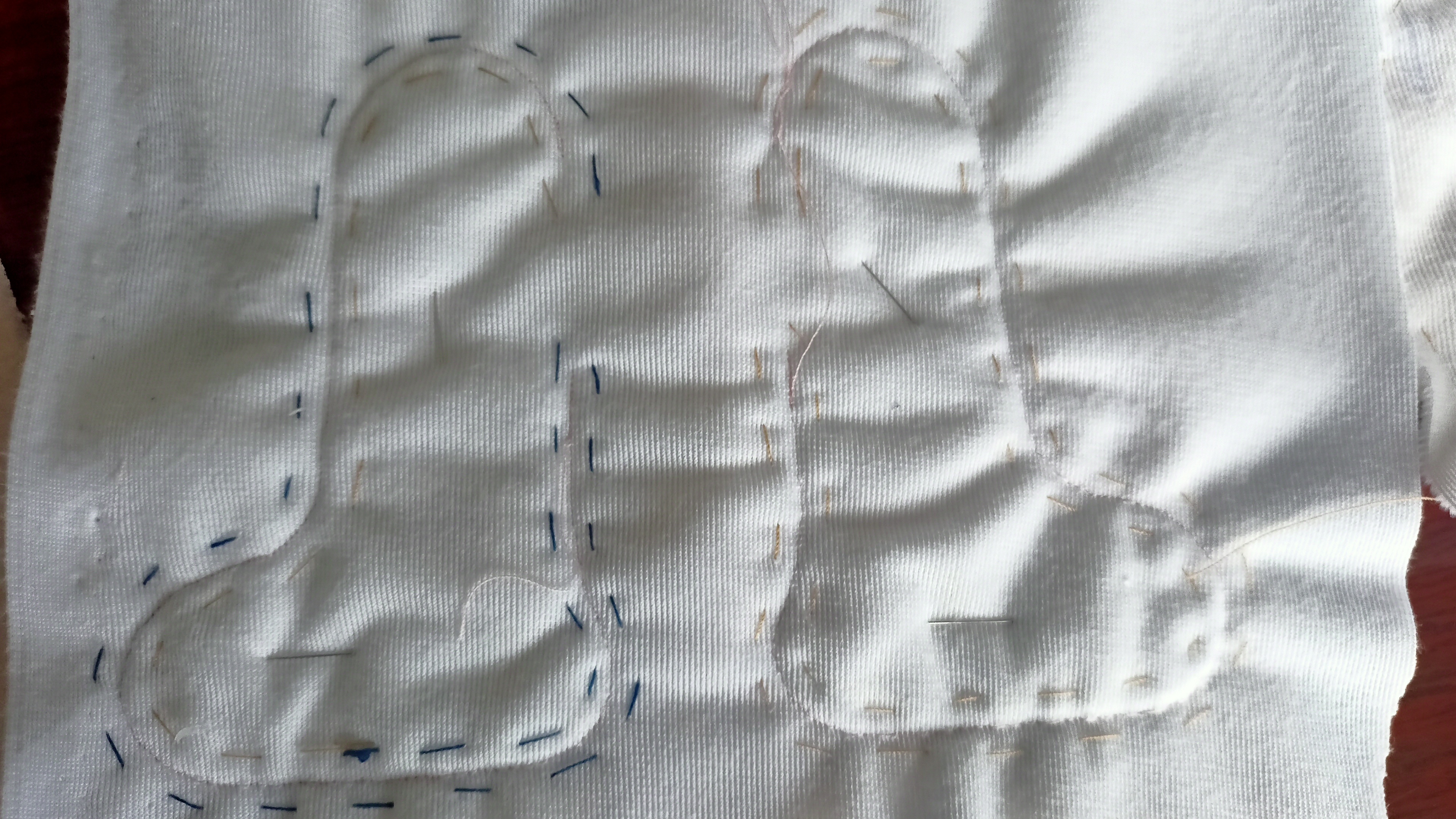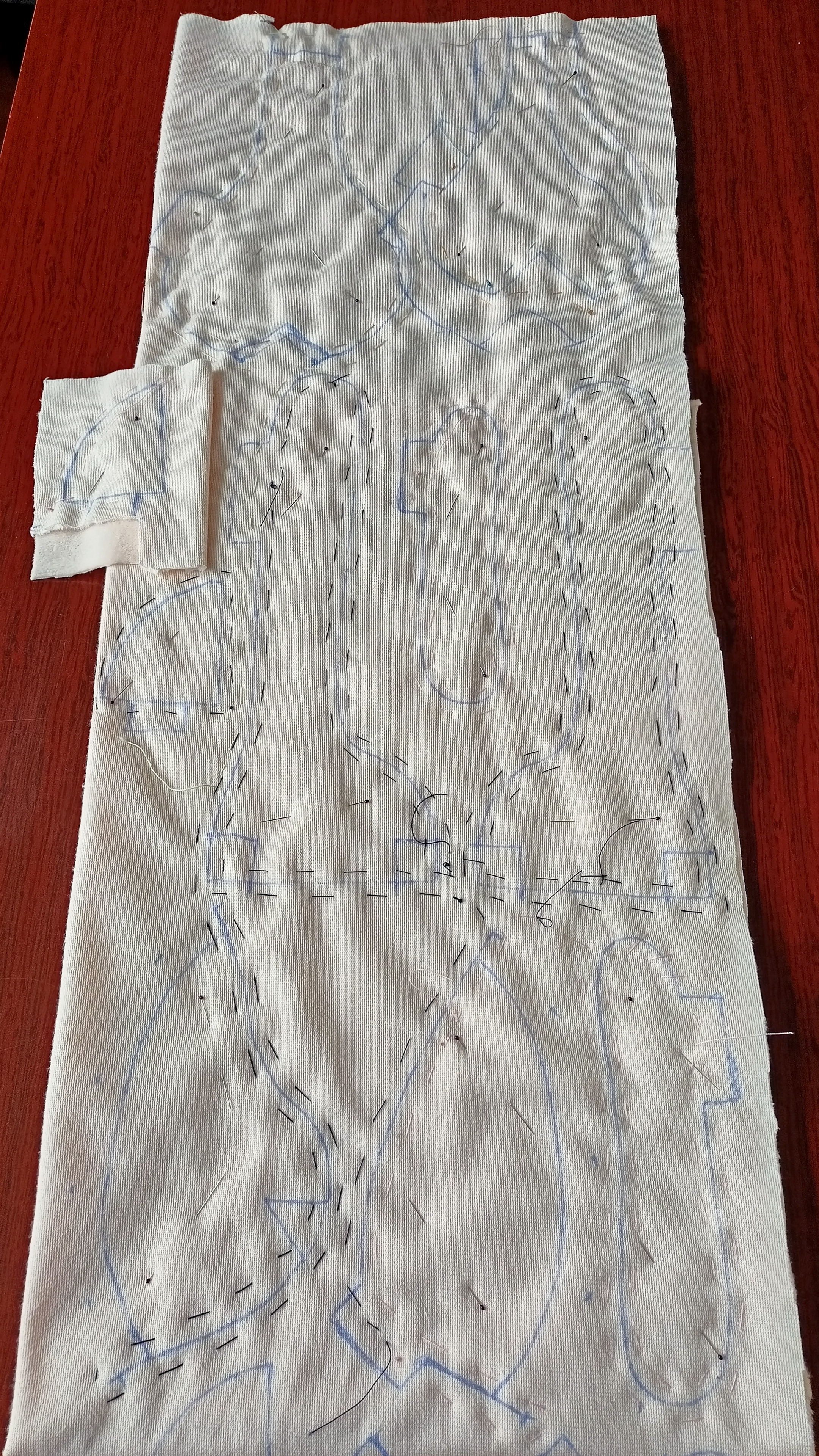 2. Я люблю располагать выкройки сразу на большом отрезе ткани, примерно понадобится 50х50 см. Обводим их терморучкой. Оставляем между ними расстояние на припуски. Если вы делаете раскладку на большом отрезке ткани, то можно оставить 0,5 см, если на маленьких кусочках, то 0,7 – 1 см, чтобы удобнее было прокладывать строчку на машинке.